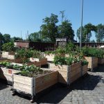 Seit vergan­genem Jahr arbeiten zudem zwei Frauen im Rahmen des Bundes­frei­wil­li­gen­dienstes – „Buftis“ – im Stadt­garten. „Sie übernehmen ganz wichtige Vermitt­lungs­ar­beit“, ist Koopmann froh. So konnte mit der Grund­schule Bebelhof und dem Kinder­garten eine Koope­ra­tion aufgebaut werden. Jede Schul­klasse kommt in jedem Halbjahr für ein Projekt, dazu gibt es Ferien­an­ge­bote. So betreut eine Klasse zum Beispiel das Erbsen-Hochbeet: die Schüler übernehmen das Aussäen, später bauen sie die Rankhilfen und am Ende kommen sie zum Ernten. Auch für die zahlrei­chen, von der Lebens­hilfe Braun­schweig unter­stützten Menschen, die im Bebelhof wohnen, gibt es Angebote. „Der Bebelhof gilt als sozialer Brenn­punkt. Wir vermit­teln hier spiele­risch Themen wie gesunde Ernährung, manchmal auch versteckt und ohne dass die Teilnehmer es merken“, lächelt Koopmann. Für die Arbeit mit den Schul­klassen, einen Kochkurs für Mütter mit Kindern und mit Flücht­lingen konnte sie nun mit Unter­stüt­zung verschie­dener Stiftungen eine Außen­küche finan­zieren, die demnächst aufge­stellt wird. Teilnehmer des „Brücken-Bauer“-Projektes der Bürger­stif­tung und der Öffent­li­chen Versi­che­rung Braun­schweig errich­teten einen Lehmofen, in dem nun Brot und Pizza gebacken wird. Ein Bewusst­sein schaffen für regionale Lebens­mittel und bewusste Ernährung ist ein beson­deres Ziel des Stadt­gar­tens.
