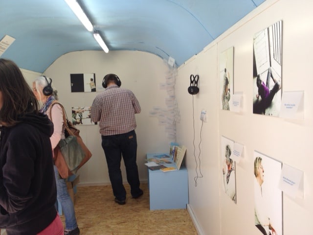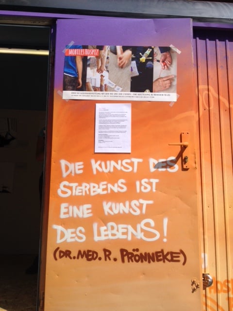 Beim „mobilen Hospiz“ handelt es sich um einen bunt bemalten, ausrangierten Bauwagen. Innen werden die künstlerischen Arbeiten zu Themenbereichen wie Zuwendung, Würde, Umgang mit Trauer und vielem mehr ausgestellt – mitten in der Stadt, für jedermann sichtbar. „Die Kunst des Sterbens ist eine Kunst des Lebens“, steht groß und deutlich an der Tür des Bauwagens geschrieben – von innen. Besucher nehmen diesen Satz des Palliativmediziners Dr. Rainer Prönnecke aus Braunschweig also beim Verlassen des Wagens mit auf ihren weiteren Weg. Die Ausstellungen sollen sensibilisieren. Sie sind Anstoß, um über würdevolles Sterben nachzudenken.