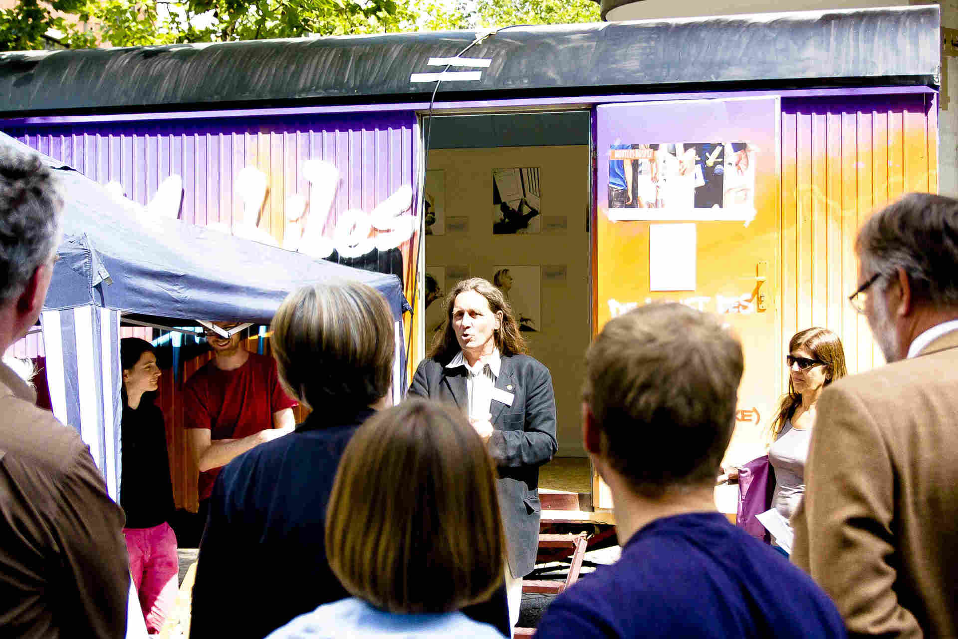 Kunstprojekt „Mobiles Hospiz“ zeigt sich im kunterbunten Bauwagen mitten in der Stadt.