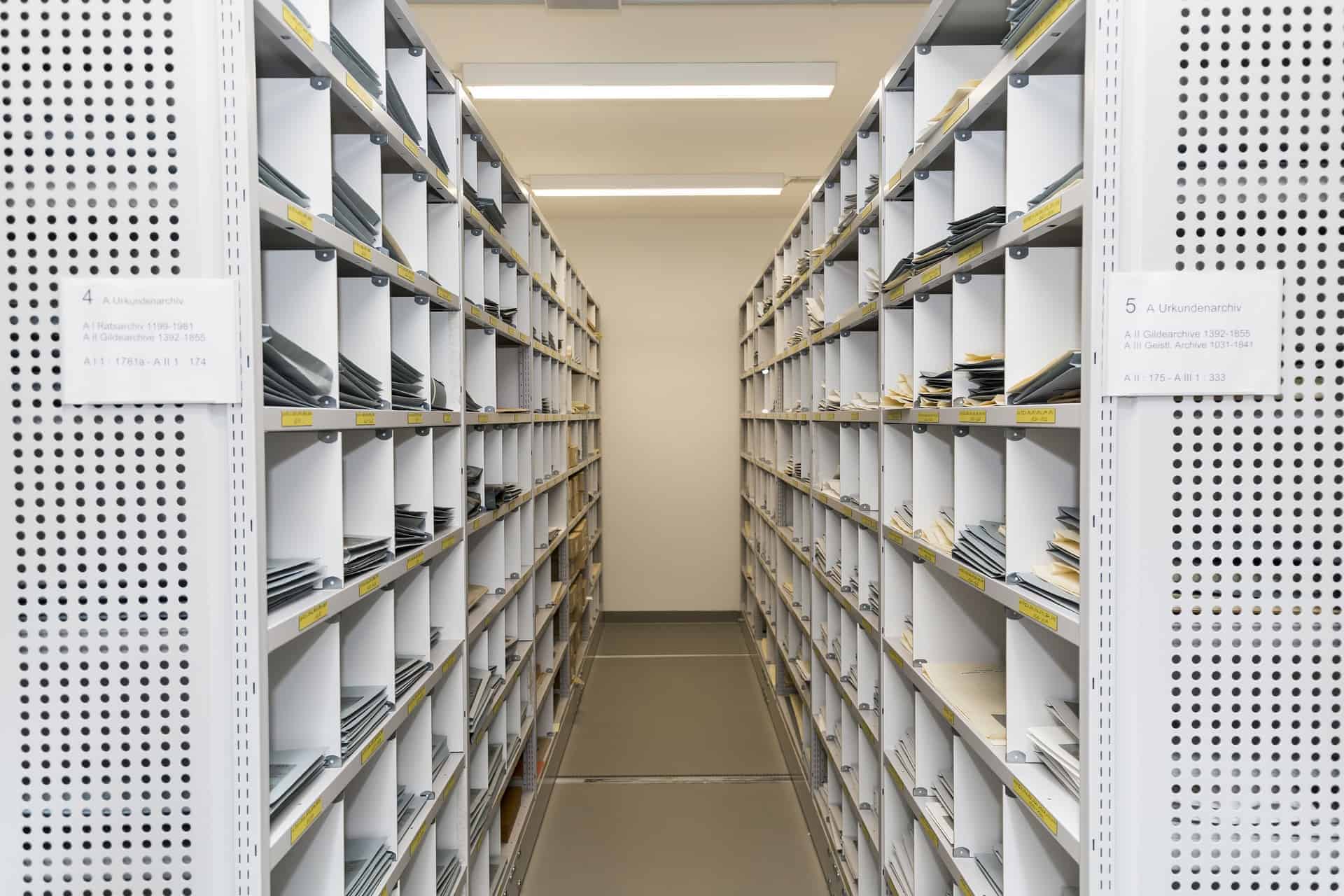 „Besser als es uns derzeit hier im Schloss geht, ging es dem Stadtarchiv wahrscheinlich nie. Die Unterlagen sind klimatisiert untergebracht, alles ist auf dem neusten Stand der Technik. Wir haben sogar eine Kühlkammer für unsere Glasplatten und Dias. Und unseren Benutzern können wir zeitgemäßen Service anbieten, im Lesesaal und auch darüber hinaus mit der technischen Infrastruktur. Seit der Unterbringung im Schloss haben wir die Benutzung verdoppeln können gegenüber der Zeit davor. Das liegt natürlich auch daran, dass das Stadtarchiv nun wesentlich zentraler als früher liegt“, erläutert Henning Steinfüher, Leiter des Stadtarchivs.