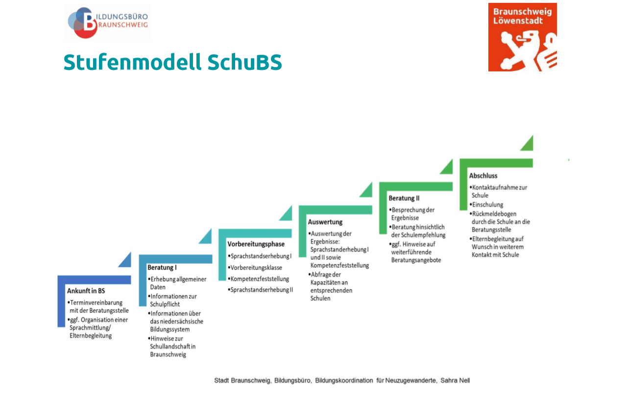 Mit dem Konzept „Schulbildungsberatung Braunschweig“ (SchuBS) für 10 bis 18 Jahre alte Kinder und Jugendliche besitzt die Stadt Braunschweig bundesweit ein Alleinstellungsmerkmal. „Die Beratung ist für neu zugezogene Familien aus dem In- und Ausland gedacht“, erläutert Sahra Nell vom städtischen Bildungsbüro, die das Konzept ausgearbeitet hat. Das Stufenmodell, bestehend aus Erstberatung, Vorbereitungsklassen, Ressourcenanalyse und Auswertungsgespräch mit den Eltern, ist längst Vorbild für andere Städte und Kommunen geworden. Das Bedürfnis nach Informationen zur Struktur und zur Vernetzung mit anderen Beratungsstellen ist groß. Deswegen hat die Stadt einen Hospitationstag für interessierte niedersächsische Kommunen in der Heinrich-Büssing-Schule angeboten. Zu Gast waren Vertreterinnen und Vertreter Hannover, Oldenburg, Gifhorn, Hildesheim und Peine.