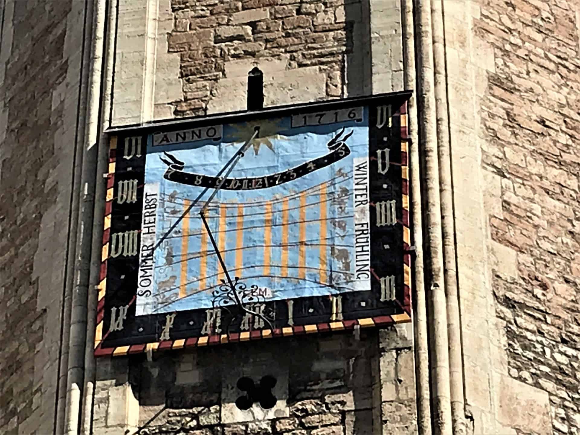 Man stelle sich das im 18. Jahrhundert einmal vor! Einen „Regulator“, also eine aufziehbare Uhr, konnten sich damals nur die allerwenigsten leisten. Also mussten die Sonnenuhren die Zeit für die überragende Mehrzahl der Bürgerinnen und Bürger angeben. Noch heute befinden sich auf der Südseite des Domes vier davon. Skurril, dass es gleich vier Stück an quasi ein und derselben Stelle gibt. Schauen wir doch einmal genauer hin.