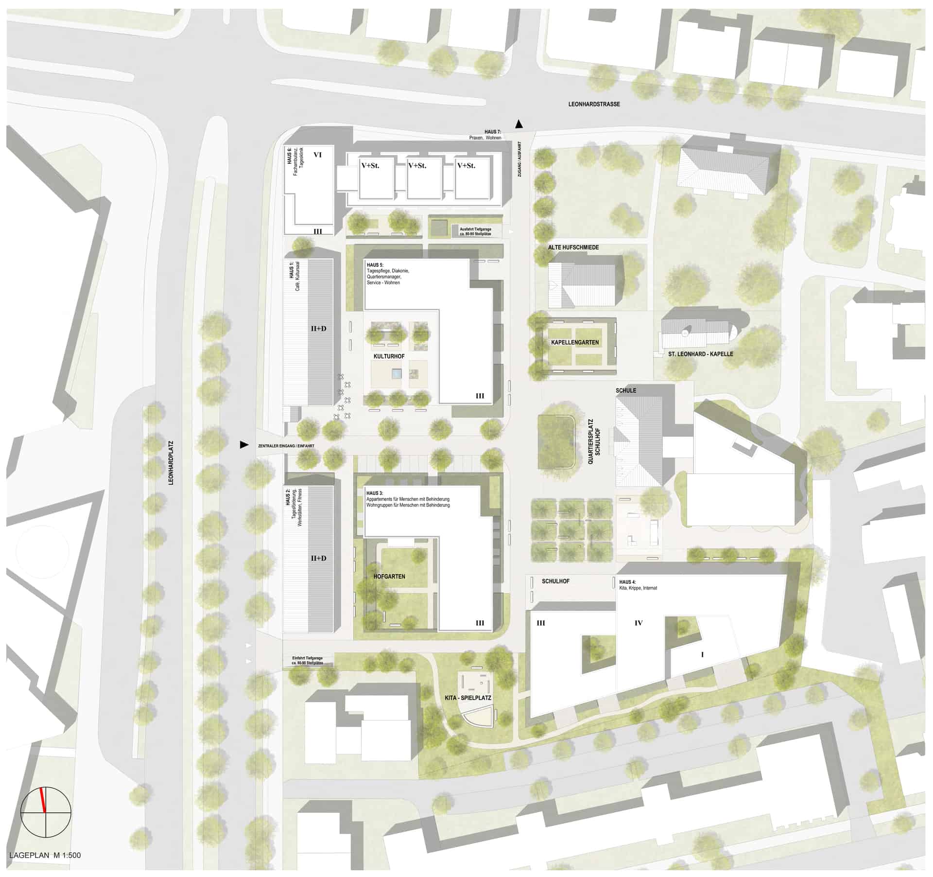 Integriert werden bei der umfang­rei­chen Neuge­stal­tung die beiden ehema­ligen Stall­scheunen, die entlang der Leonhard­straße gegenüber der Stadt­halle stadt­bild­prä­gend sind. Sie werden denkmal­ge­recht saniert. Später werden dort ein Kultur­saal und ein Café sowie Räume für Tages­för­de­rung, Behin­derten-Werkstätten und Fitness unter­ge­bracht. Abgerissen werden dagegen die Ruine der nördlich gelegenen früheren Reithalle und der südlich gelegenen einstige Pferde­stall. Auf dem insgesamt knapp 15.000 Quadrat­meter großen Areal werden fünf Häuser in klarer, moderner Archi­tek­tur­sprache neu gebaut. Das markante Eckhaus an der Kreuzung Leonhardstraße/Leonhardplatz wird sechs­ge­schossig, die Bauten im Inneren drei- bis vierge­schossig.
