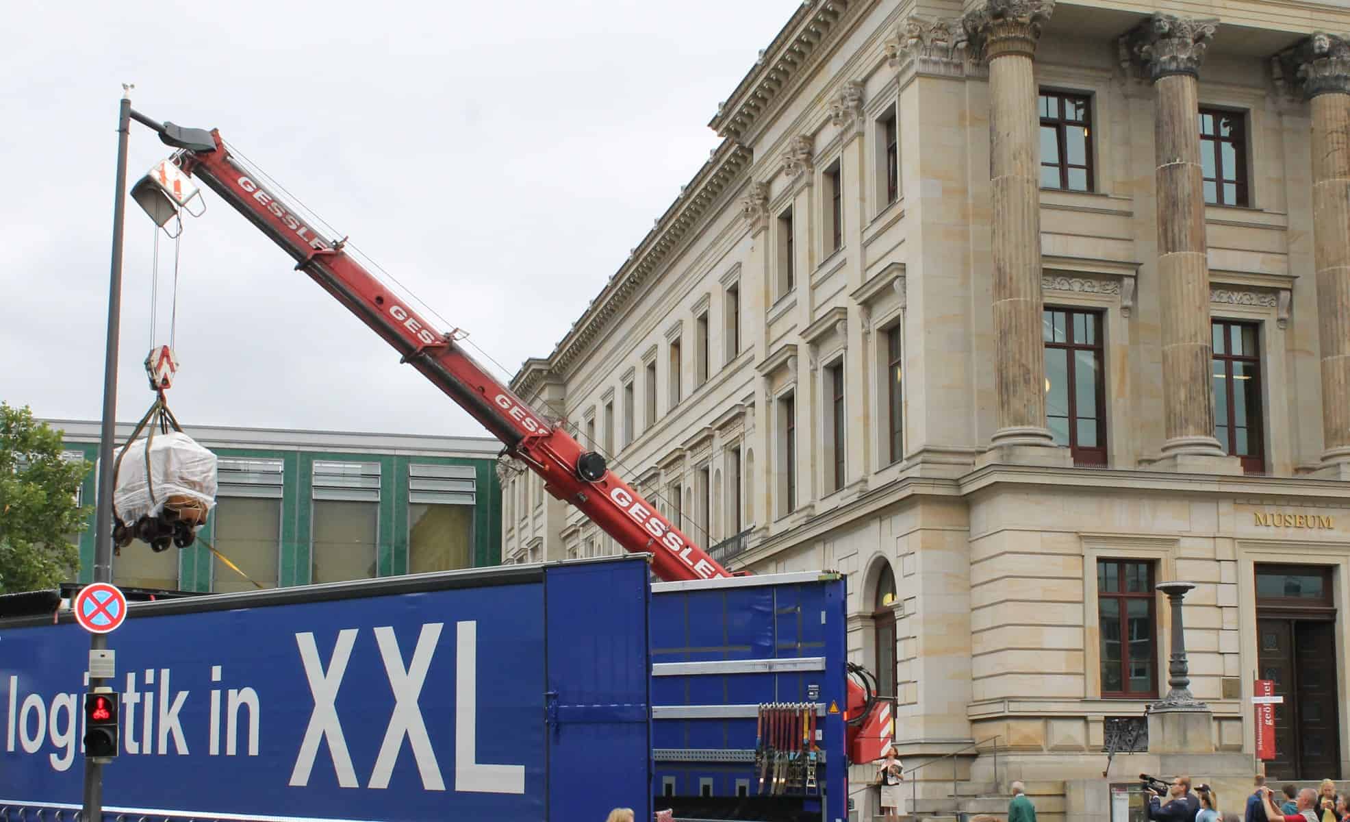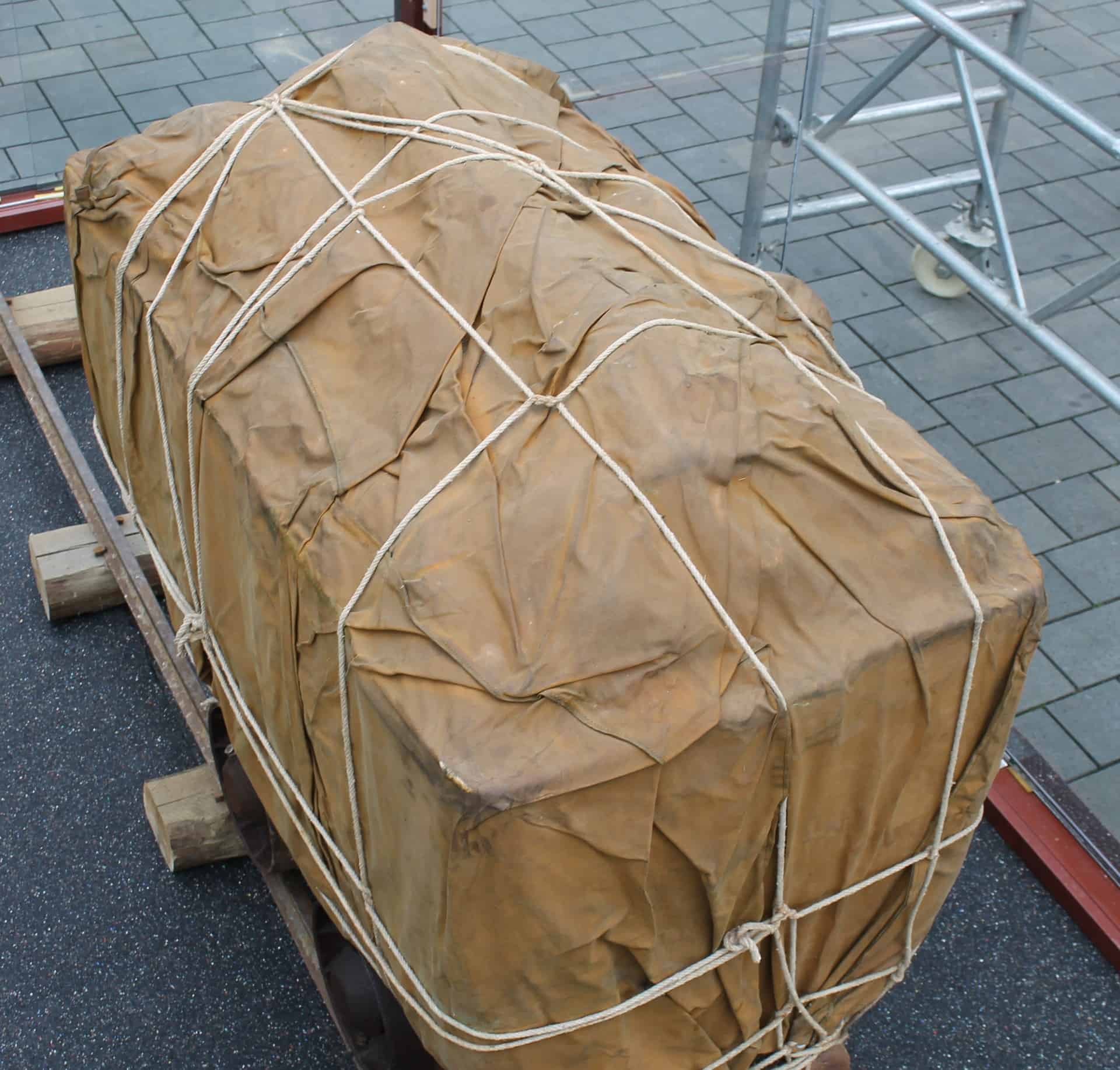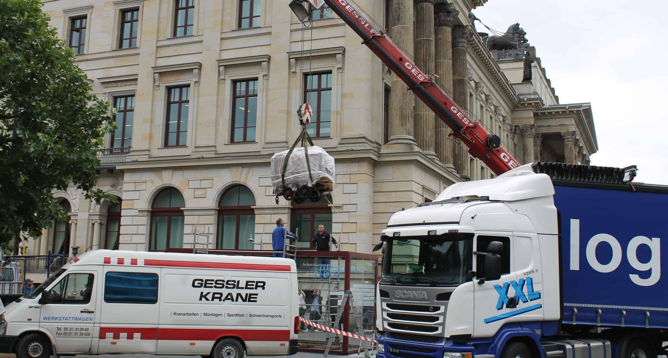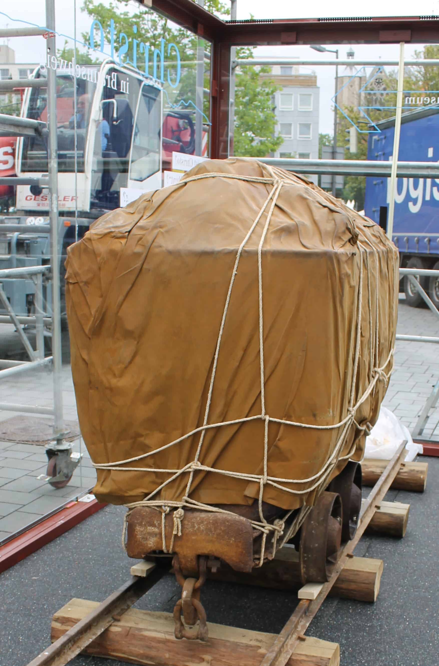 Der Förder­wagen wurde heute als Schwer­trans­port von Goslar nach Braun­schweig überführt. Er ist eine Leihgabe des Mönche­haus Museums Goslar. Der drei Tonnen schwere Koloss wurde auf dem Schloss­platz an Stahl­seilen eines mobilen Krans hängend in einer öffent­lich­keits­wirk­samen und spekta­ku­lären Aktion an seinen Bestim­mungsort gehievt. Der Hunt wird von einer veran­kerten Sicher­heits­glas-Konstruk­tion, die 6 Meter lang und 2.40 Meter breit ist, mit einem Dach aus Stahl vor Wind und Wetter geschützt. „Package on a Hunt“ ist als Botschafter der exqui­siten Ausstel­lung für jedermann frei zugäng­lich.