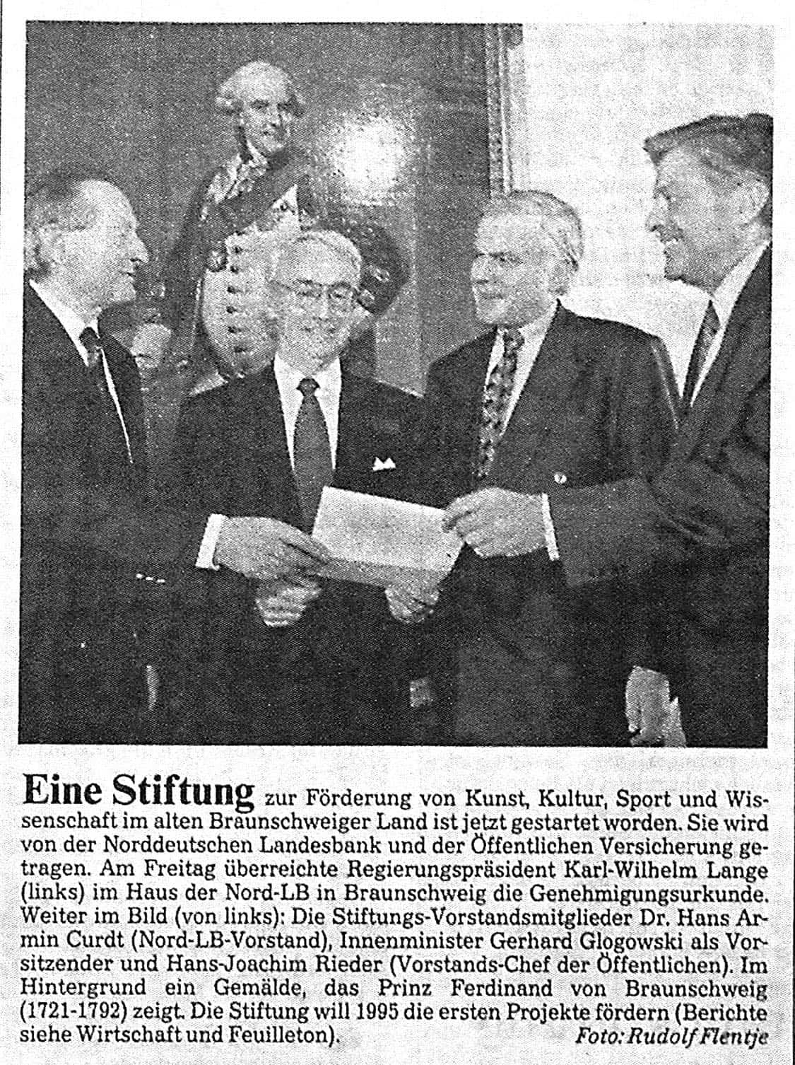 1994: Es war die Topmeldung der Braunschweiger Zeitung am 30. März. „Eine Stiftung zur Förderung von Kunst, Sport und Wissenschaft im alten Braunschweiger Land ist jetzt gestartet worden. Sie wird von der Norddeutschen Landesbank und der Öffentlichen Versicherung getragen.“ Als Vorsitzender nahm Gerhard Glogowski die Genehmigungsurkunde aus den Händen des damaligen Regierungspräsidenten Karl-Wilhelm Lange im Haus der Nord LB entgegen. Seitdem berät, vermittelt und fördert die STIFTUNG NORD/LB • ÖFFENTLICHE Projekte mit der Absicht, für die im Land Braunschweig lebenden Menschen und gemeinsam mit ihnen eine attraktive, identitätsstiftende Region zu gestalten. Bis zum Jahresende 1995 lag die Zahl der bewilligten Projekte bereits bei 59.