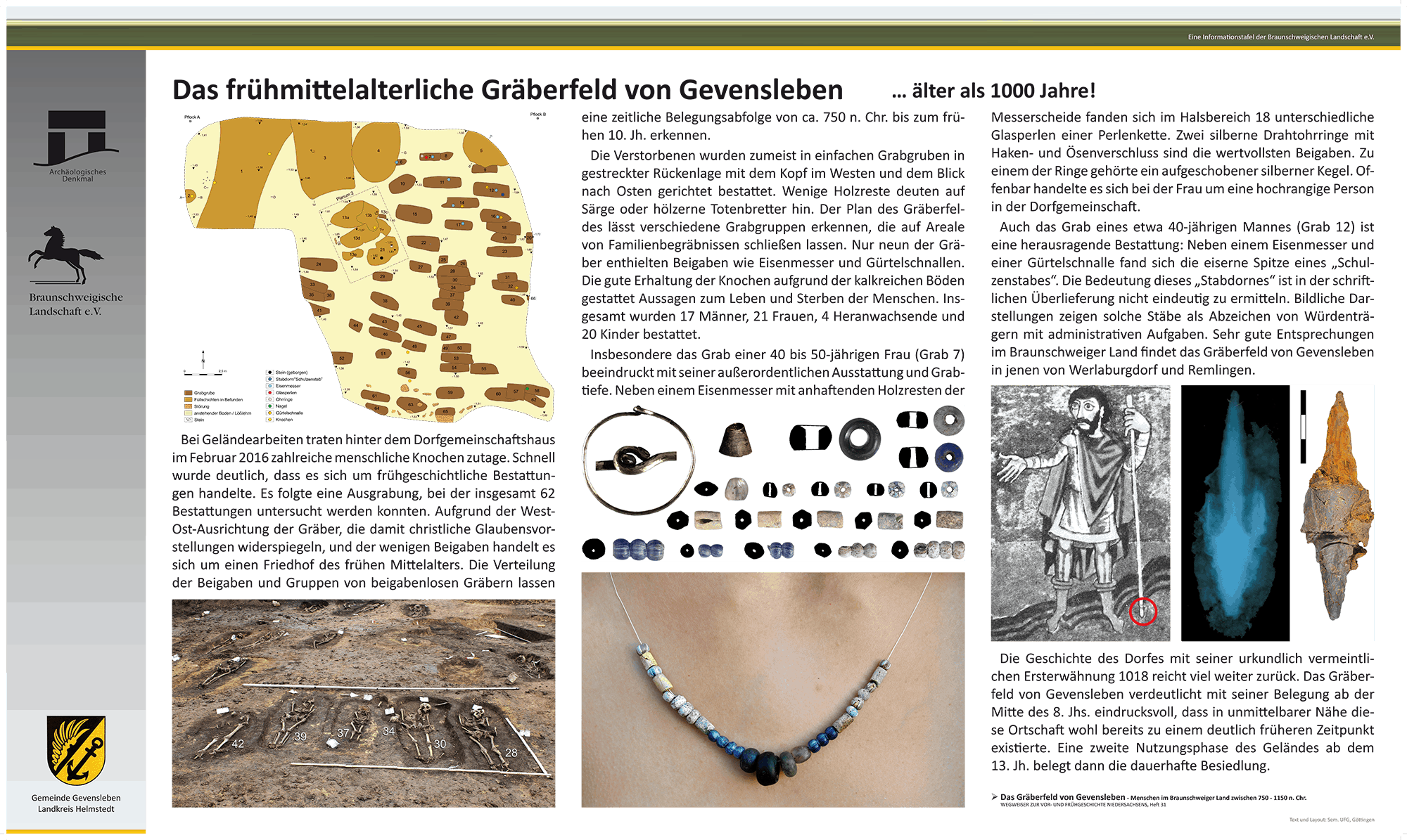 Auf einen historischen Fund anderer Art wird von September an ein Informationsschild hinweisen, das in Kooperation mit der Braunschweigischen Landschaft vor dem Dorfgemeinschaftshaus in Gevensleben aufgestellt wird. Es erinnert an ein Gräberfeld, das im Februar 2016 bei Geländearbeiten entdeckt worden war. Bei den Ausgrabungen, die ebenfalls Immo Heske leitete, wurde erforscht, dass es sich dabei um frühgeschichtliche Bestattungen handelte. Einen direkten Zusammenhang mit der Hünenburg gibt es dabei angesichts der großen Zeitdifferenz nicht. Die Belegungsabfolge reicht bei diesen Gräbern von etwa 750 n. Chr. bis zum frühen 10. Jahrhundert. Die Geschichte des Dorfes Gevensleben mit seiner urkundlichen Ersterwähnung im Jahre 1018 reicht demzufolge viel weiter zurück. Die Grabungsstelle ist längst wieder verschüttet.