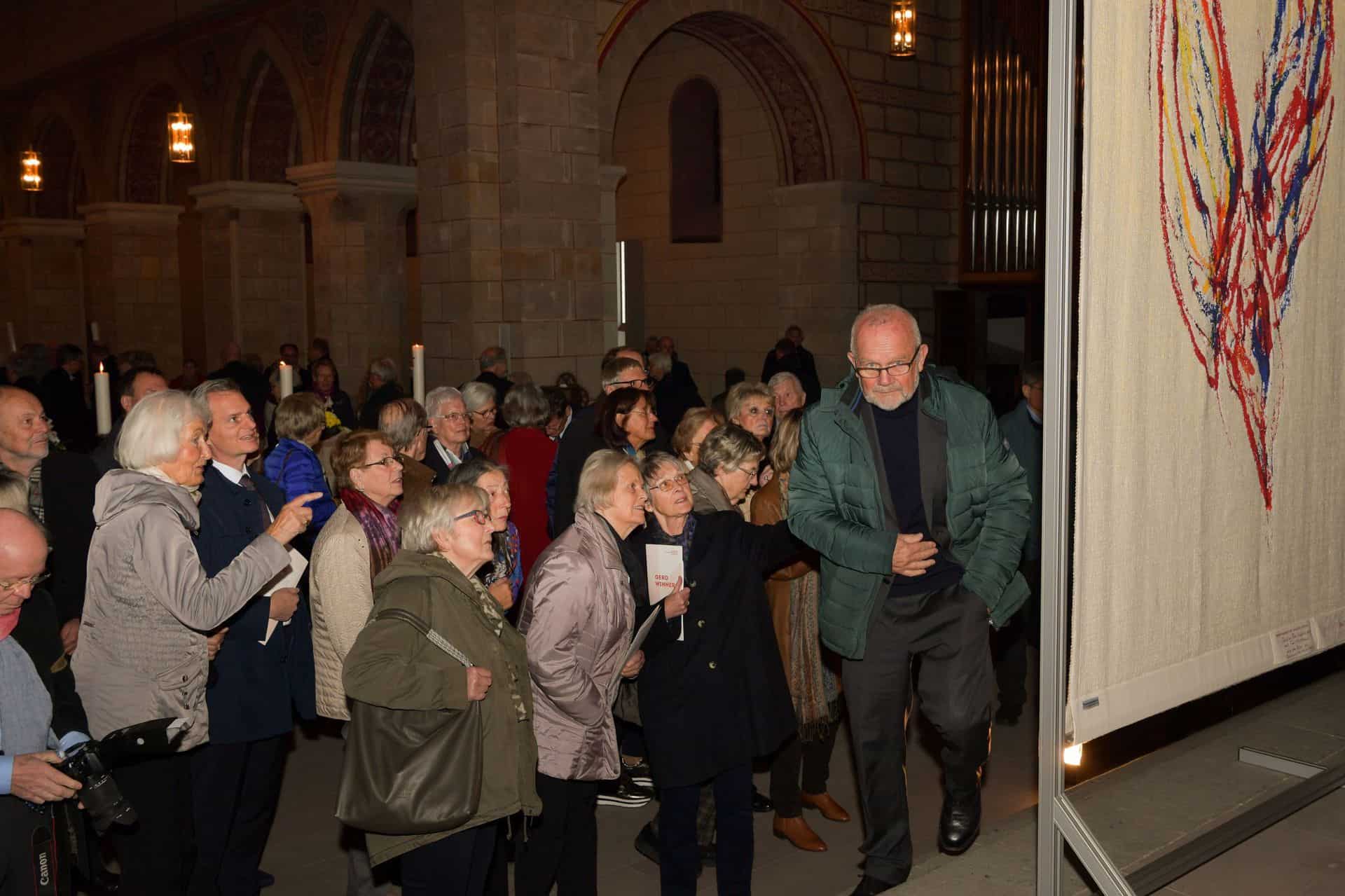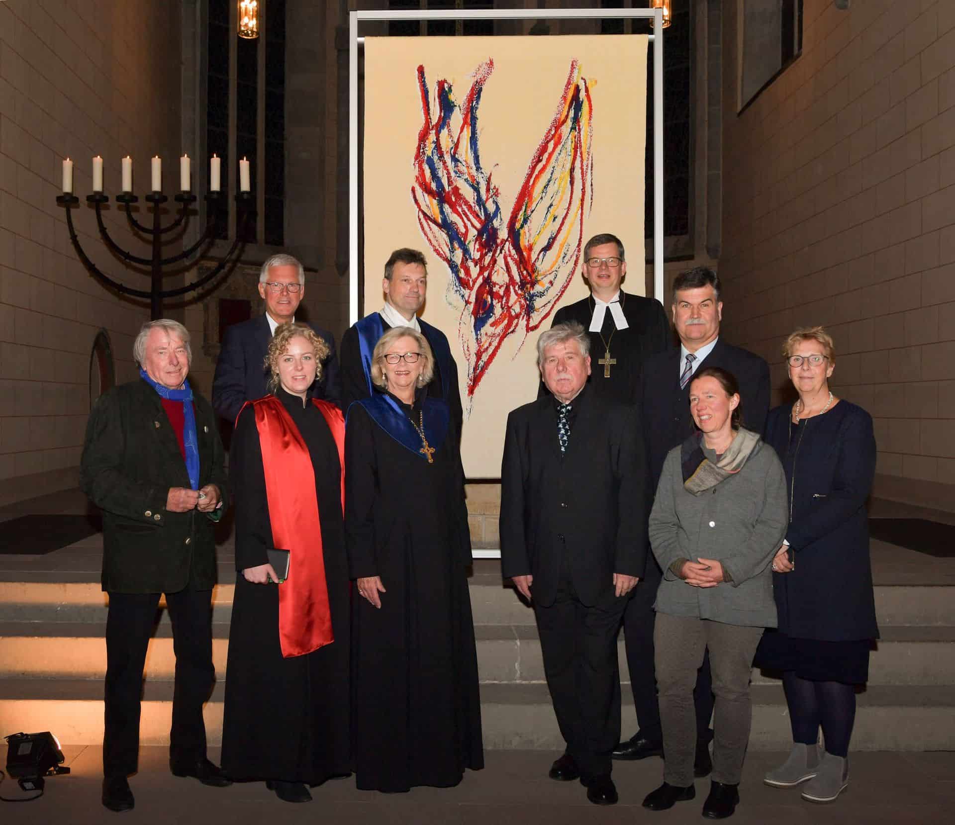 Mechthild von Veltheim, Geschäftsführerin der Paramentenwerkstatt und Domina des Klosters St. Marienberg, erinnerte sich an den Ausspruch Angela Neddermeiers, als sie die Vorlage erstmals sah: „Sie bekam einen Schock und sagte, wie soll ich das nur umsetzen? Heute meint sie, es sei ihr Meisterstück geworden.“ Krankheitsbedingte konnte Angela Neddermeyer leider nicht bei der Präsentation ihres Werkes dabei sein. „Frau Neddermeyer hat jeden Farbspritzer mitgewebt, darauf bestand sie“, lobte Gerd Winner. Für Mechthild von Veltheim war der Auftrag Herausforderung und Chance zugleich. „Wir durften zeigen, was wir können“, freute sie sich über den Auftrag.