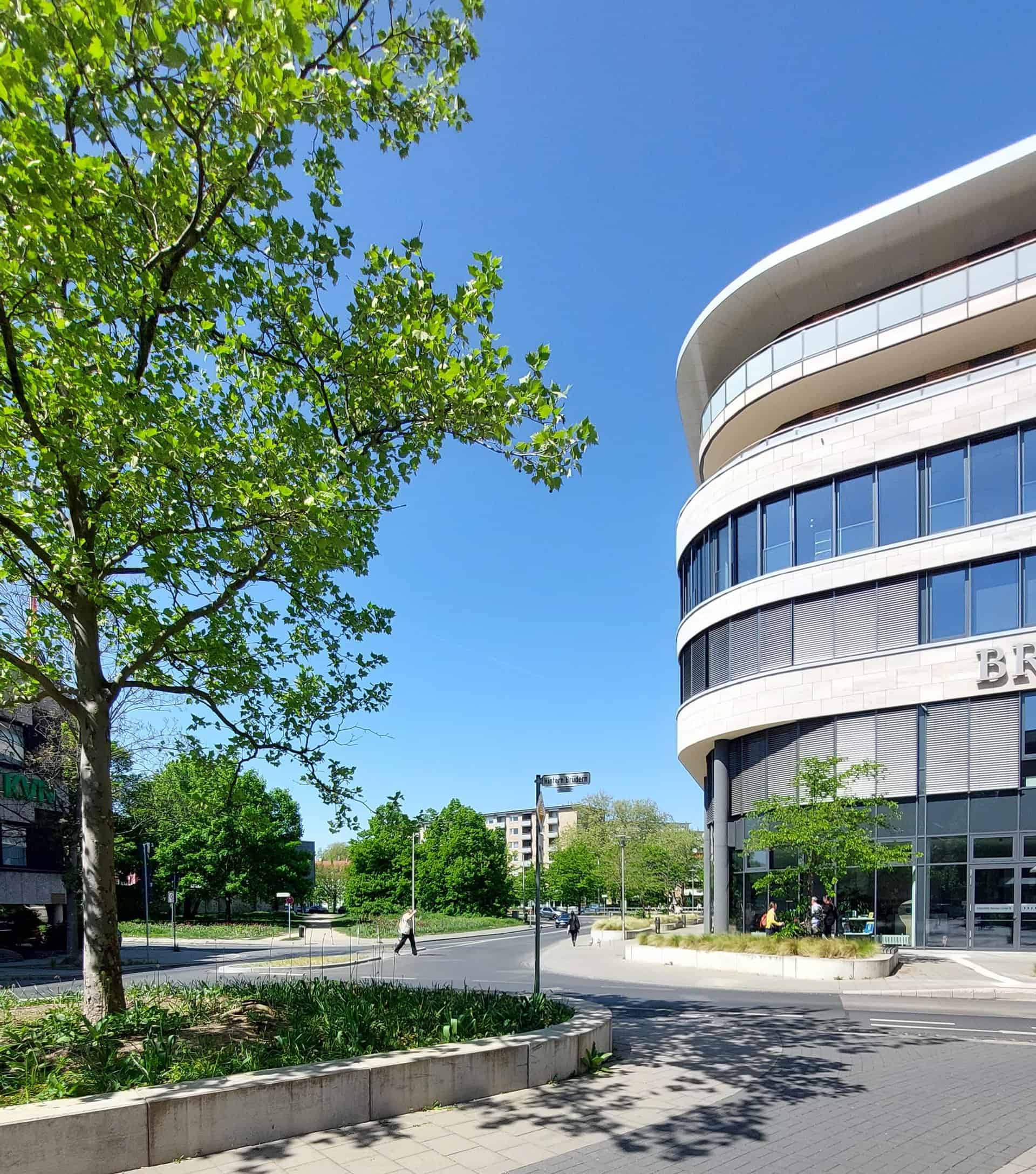 In der Nordhälfte der Braun­schweiger Innen­stadt hatten sich bis zur Zerstö­rung während des Zweiten Weltkrieges weitläu­fige Quartiere mit ihrer Bebauung aus dem späten Mittel­alter und der Frühen Neuzeit erhalten. Dies gilt in beson­derem Maße auch für das Umfeld von Petri- und Brüdern­kirche. Der leicht gewundene Straßenzug Hintern Brüdern verläuft noch heute nördlich der ehema­ligen Franzis­kaner-Kloster­kirche. Gegenüber dem Kirchenbau erhebt sich heute eine im Stil der Postmo­derne entwor­fene Wohn- und Geschäfts­haus­an­lage aus den 1980er Jahren.