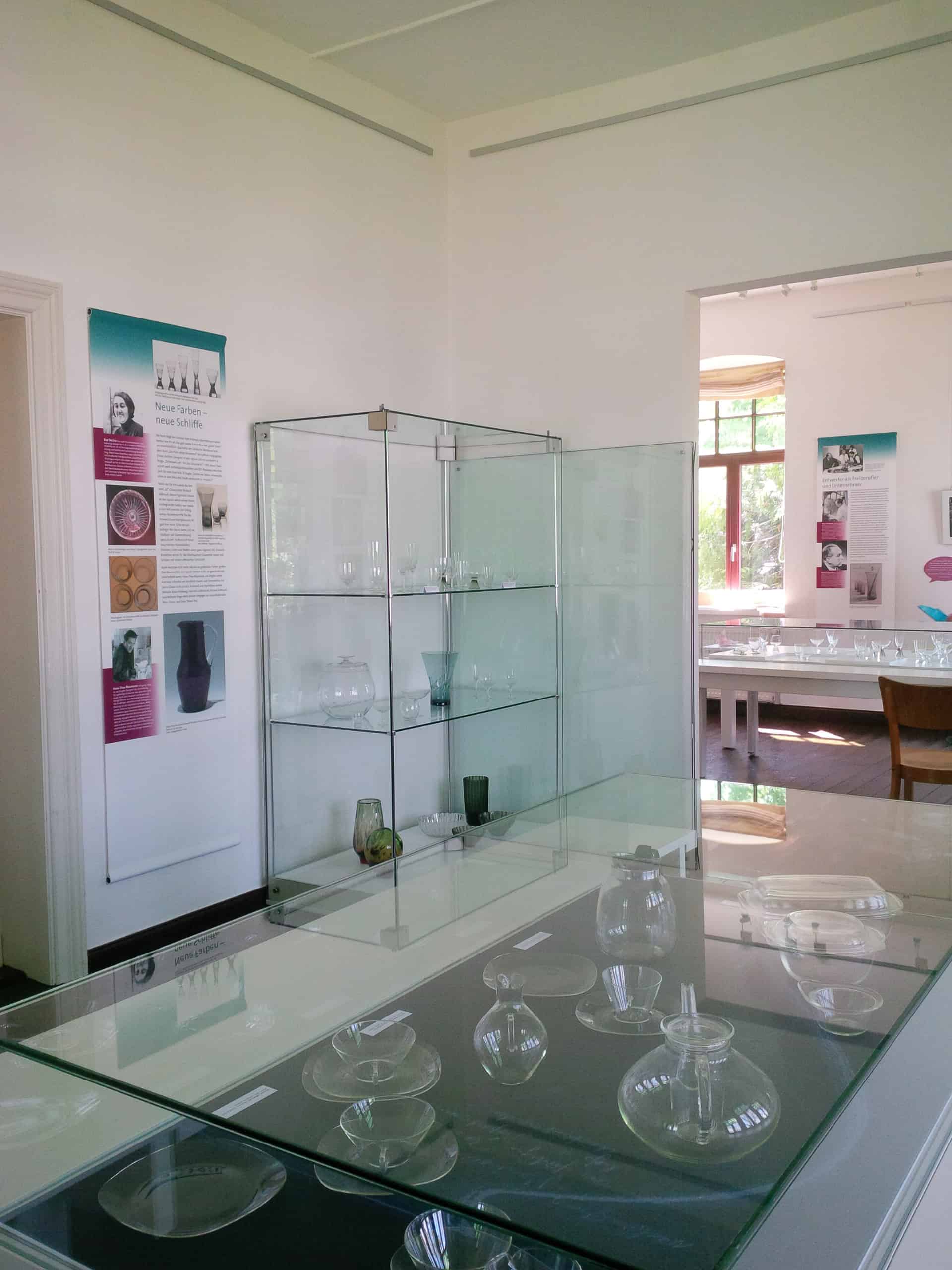 Die Gründerzeitvilla mit ihrem roten Solling-Sandstein und dem Fachwerk umgibt ein kleiner parkähnlicher Garten. „Glasmuseum“ steht auf einem Pfeiler. Die Ausstellung „Wie neu beginnen?“ im Obergeschoß führt zurück in die Zeit nach dem Zweiten Weltkrieg. Im nun geteilten Deutschland hatten viele Menschen vieles verloren – das Leben, ihr Hab und Gut, ihre Arbeit. Wie sollte nun neues Design entstehen und nach dem Nationalsozialismus aussehen? Wie Trinkgläser, Vasen oder Schalen gestaltet sein? Zehn Designer, die in Ost und West nach Antworten auf diese Fragen suchten, stellt das Museum vor.