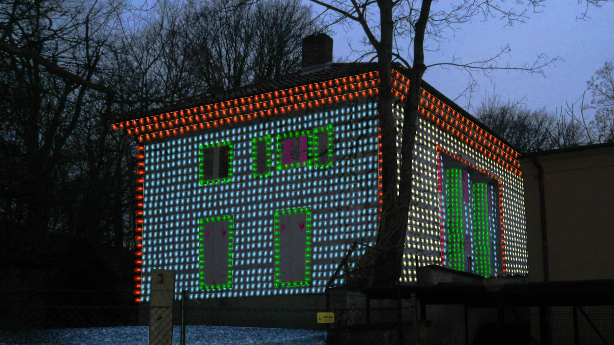In einer computergesteuerten Reihenfolge wird er die Lichterketten aufleuchten lassen. Bei Annäherung an das Haus wird von Schmidt komponierte Musik hörbar. „Insgesamt soll es die Besucher schon ein bisschen gruseln“, sagt Kevin Schmidt, der sich mit seinem Projekt an die Machart von Horrorfilmen anlehnt. Sein Kunstwerk soll anziehend und mystisch gleichermaßen sein. Zwischen Weihnachten und Halloween soll sich die Gefühlslage einpendeln. Der Künstler verspricht ein hypnotisierendes, frenetisches Spektakel dynamischer Licht- und Klangereignisse.