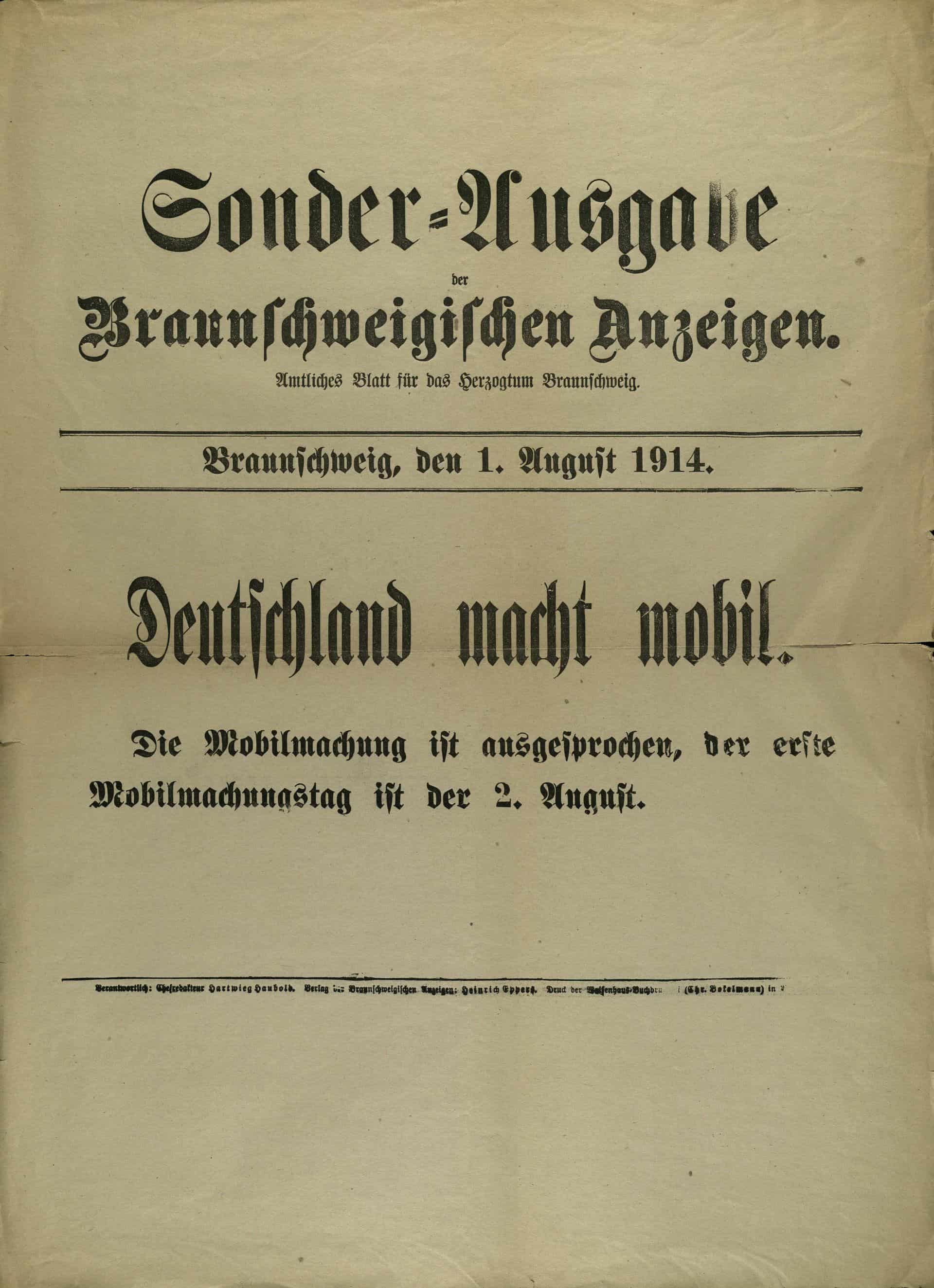 Am folgenden Tag, dem 1. August, erschien eine Sonderausgabe der Braunschweigischen Anzeigen mit nur einer Nachricht in riesigen Lettern: “Deutschland macht mobil. Die Mobilmachung ist ausgesprochen, der erste Mobilmachungstag ist der 2. August 1914.