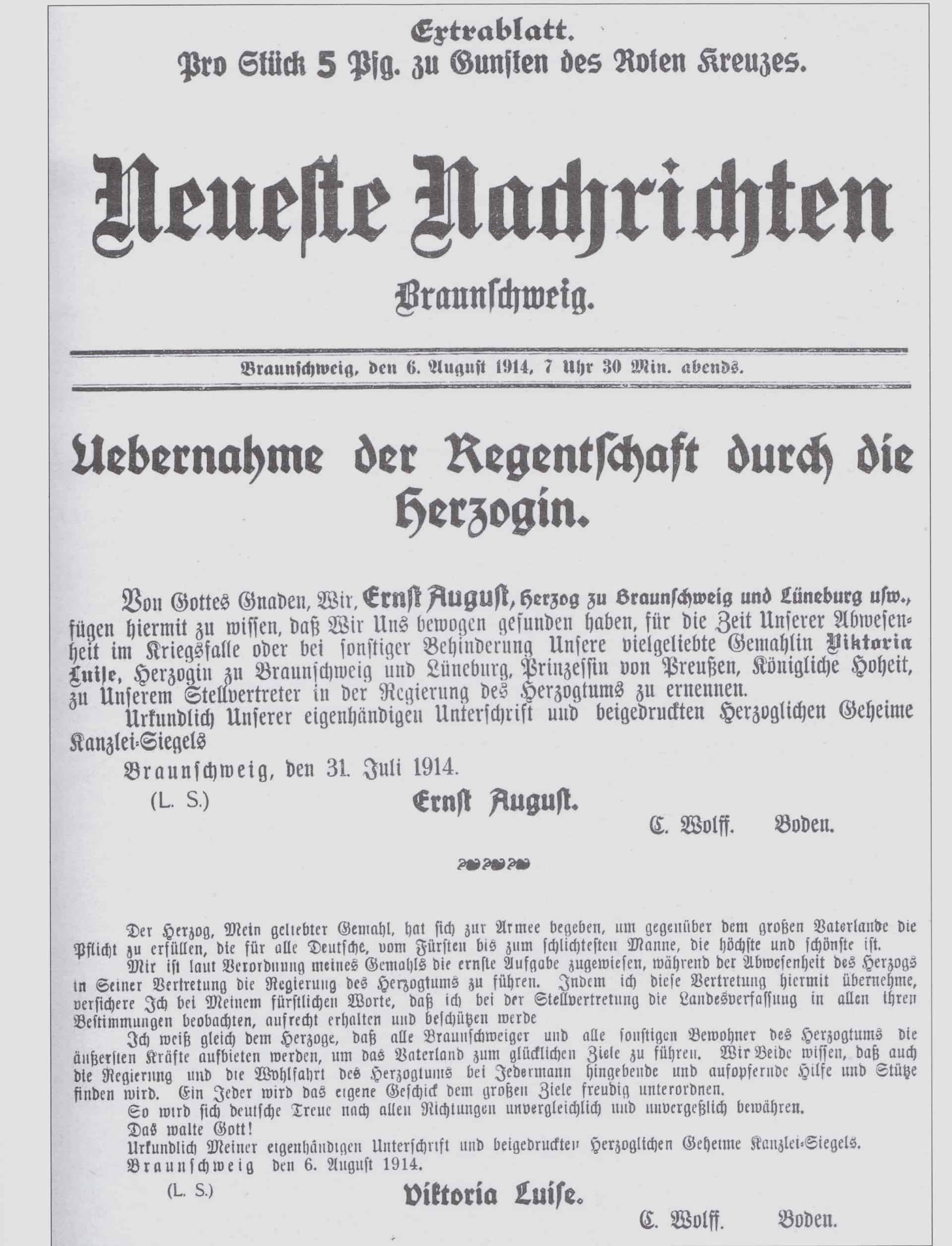 Daheim ließ Herzog Ernst August am 6. August 1914 durch Extrablatt der Neuesten Nachrichten das Volk wissen, dass er für die Zeit seiner Abwesenheit die Amtsgeschäfte der Herzogin übertrug: „Von Gottes Gnaden, Wir, Ernst August, Herzog zu Braunschweig und Lüneburg usw., fügen hiermit zu wissen, daß wir uns bewogen gefunden haben, für die Zeit Unserer Abwesenheit im Kriegsfalle oder sonstiger Behinderung Unsere vielgeliebte Gemahlin Viktoria Luise, Herzogin zu Braunschweig und Lüneburg, Prinzessin von Preußen, Königliche Hoheit, zu Unserem Stellvertreter der Regierung des Herzogtums zu ernennen?”