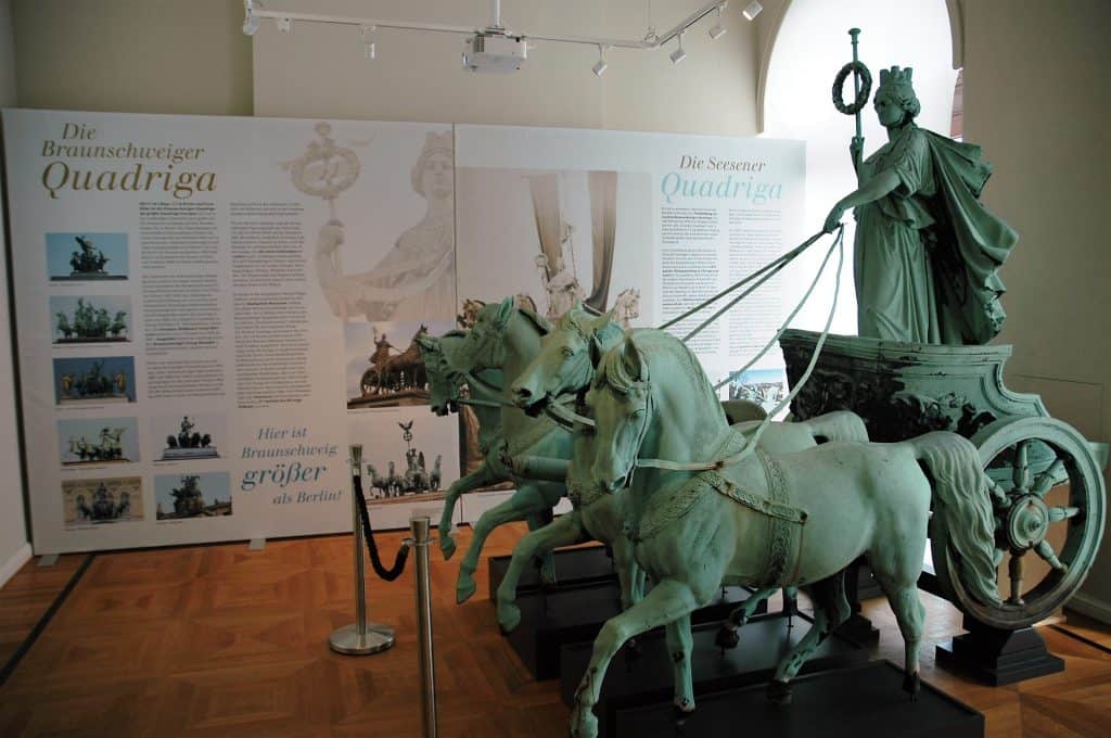 „Die Seesener Quadriga ist unangefochten das Hauptexponat unserer kleinen Ausstellung”, sagt Museumsleiterin Dr. Ulrike Sbresny, „aber auch die kleinen Nachbildungen haben einen ganz genauen Blick verdient, da man an ihnen viele Details entdecken kann.“ Gleich eine ganze Reihe dieser Nachbildungen werden im Schlossmuseum gezeigt, darunter auch eine Version in Grün und ein vergoldetes Exemplar. Aus nächster Nähe können die Besucher sowohl an den kleinen als auch an den großen Quadrigen viele Informationen über deren Herstellung und Geschichte erfahren. Das Schlossmuseum bietet Kombi-Führungen durch die Ausstellung und auf die Plattform für Kinder und Erwachsene an.