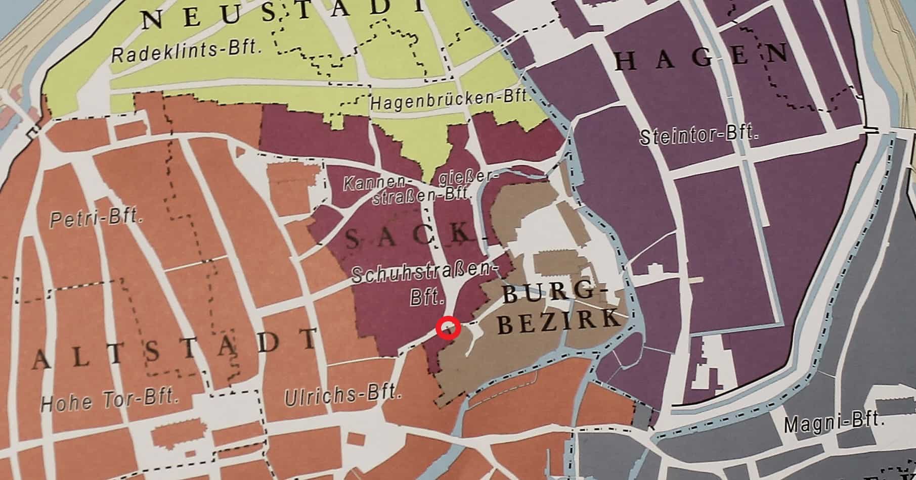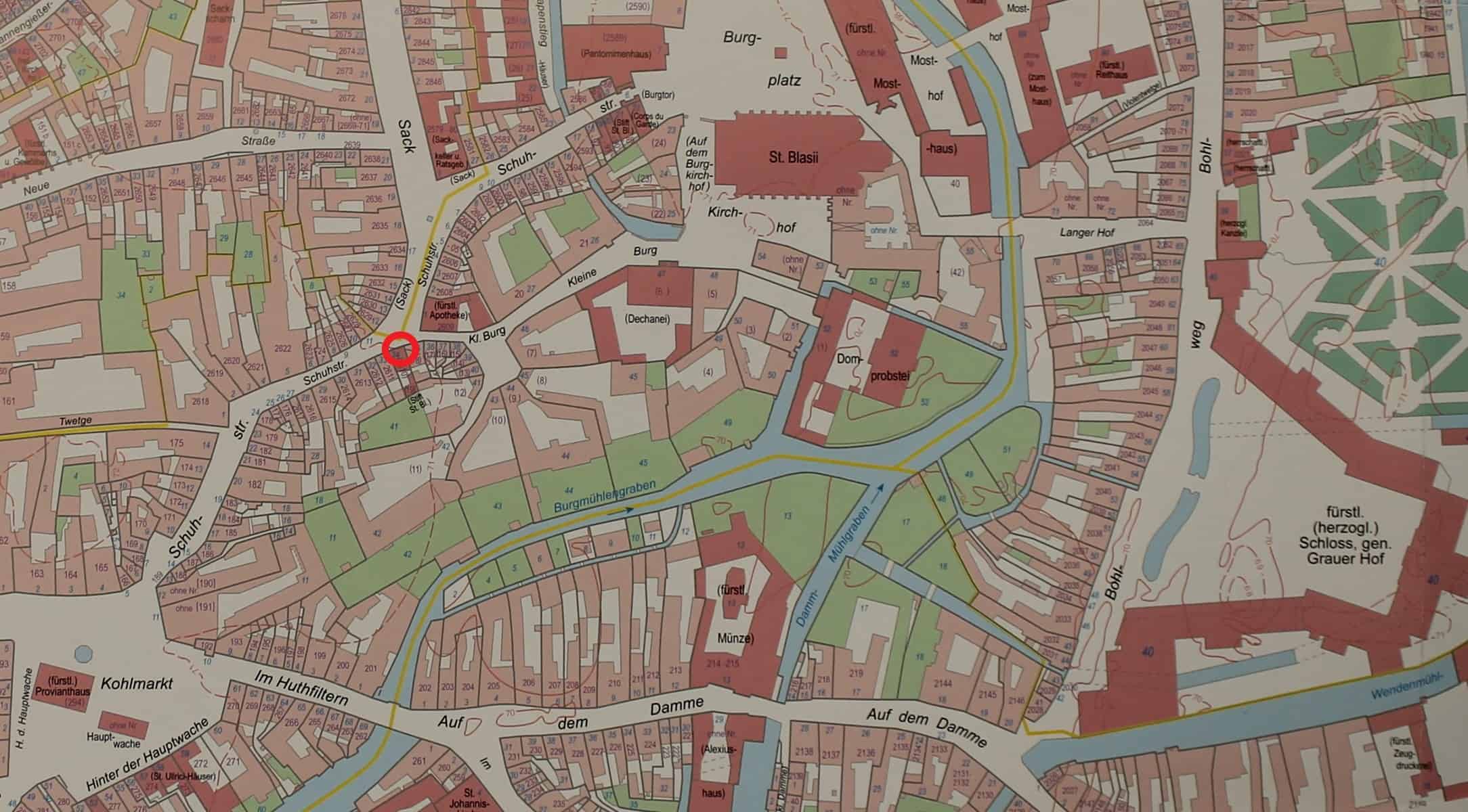 Der Deutsche Historische Städteatlas des Instituts für vergleichende Stadtgeschichte belegt, warum es ursprünglich die Verbindung zwischen der Schuhstraße und dem Hutfiltern an dieser Stelle nicht gab. Im Bereich hinter den Stiftsherrenhäusern verlief noch 1750 der Burgmühlengraben, und es existierte bereits eine geschlossene Bebauung auf beiden Seiten, die bis heute noch nachvollziehbar ist. Das wird sich nun erstmals nach mehr als 500 Jahren ändern, wenn der Eingang zur neuen Twete, der Arbeitstitel lautet für Braunschweig völlig untypisch „Burggasse“ von der Schuhstraße aus komplett offen gestaltet wird.