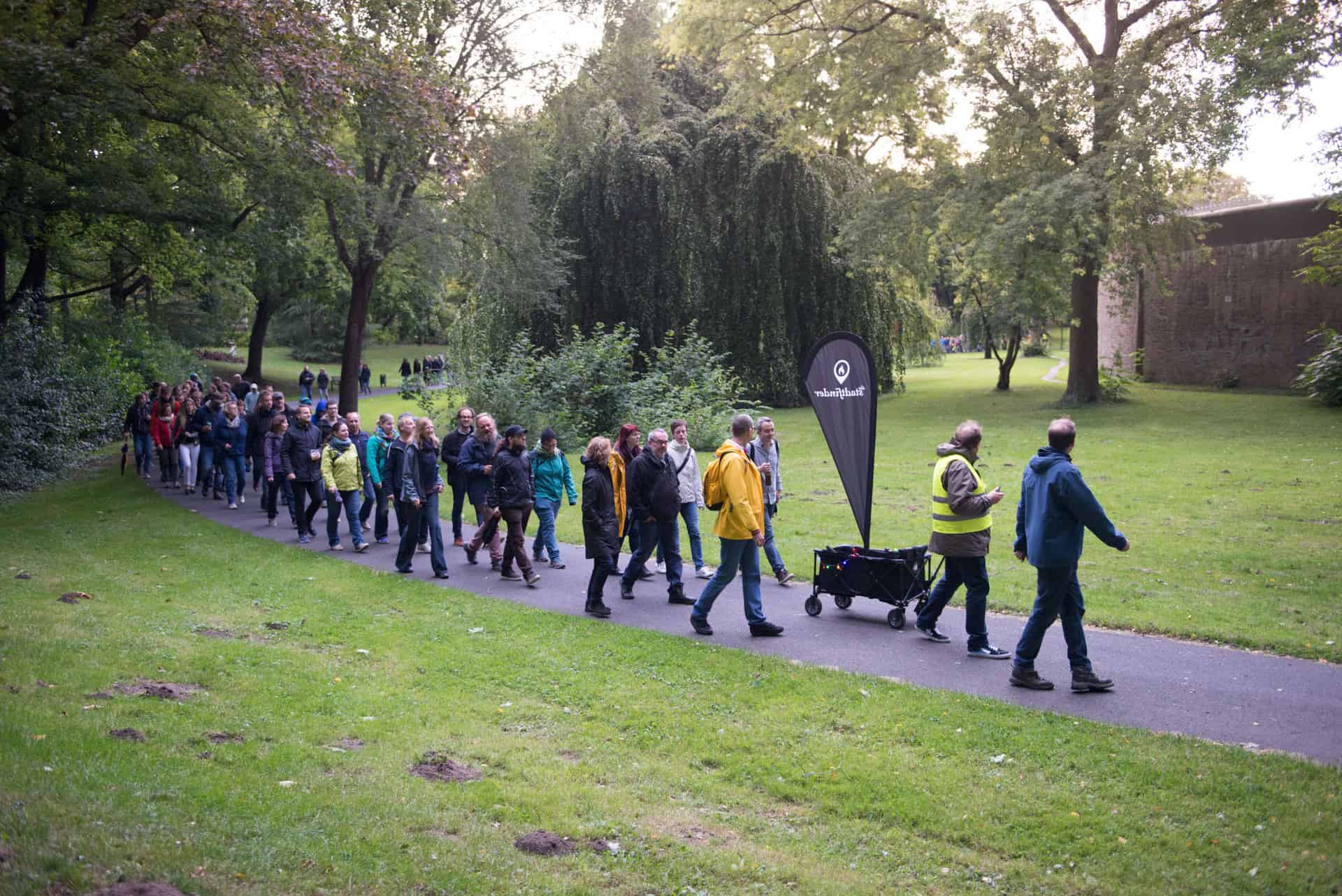 Die Stadtfinder-Touren brechen mit dem Althergebrachten. Das macht den besonderen Reiz aus und zieht ein besonderes Publikum an, bei dem es weder nach oben oder unten eine Altersgrenze gibt, wie die ersten sechs Touren zeigten. Es gibt die Kunst eben nicht dort, wo sie erwartbar ist, also nicht auf Bühnen, in Theatern oder Veranstaltungshallen. Die Teilnehmer wissen vorab lediglich den Ausgangspunkt der Tour. Alles andere überrascht.
