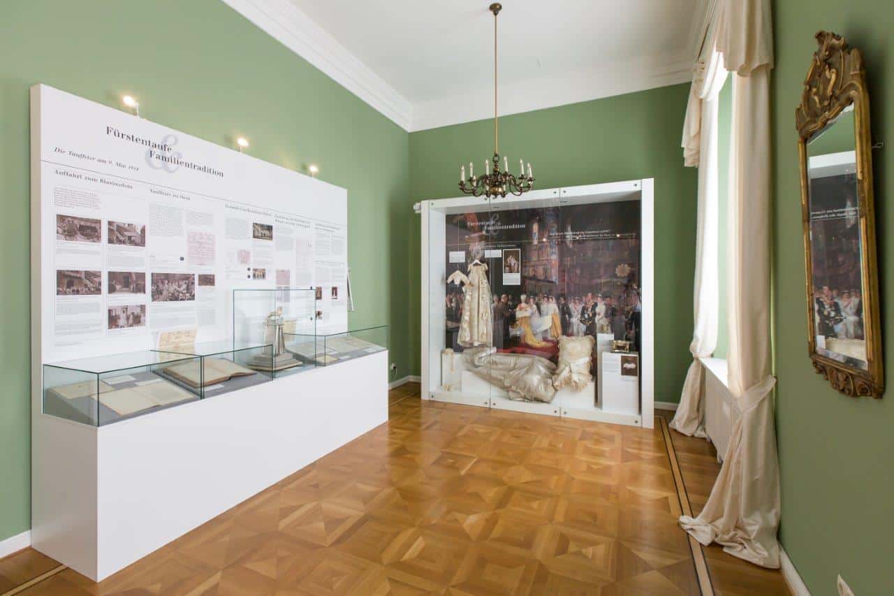 Ein Bild der Taufe im Braunschweiger Dom bildet den Hintergrund der Vitrine, in der Taufkleid mit meterlanger Schleppe und Steckkissen des Täuflings gezeigt werden. Die Leihgaben des Welfenhauses werden heute noch bei Taufen genutzt. Die Taufschale, ein Geschenk zur Geburt Ernst Augusts von den adligen Damen der Braunschweiger Gesellschaft, konnte 2005 bei einer Versteigerung auf der Marienburg erworben und zurück nach Braunschweig gebracht werden. Auch der Taufbecher seiner Mutter, Herzogin Viktoria Luise, ist zu sehen.