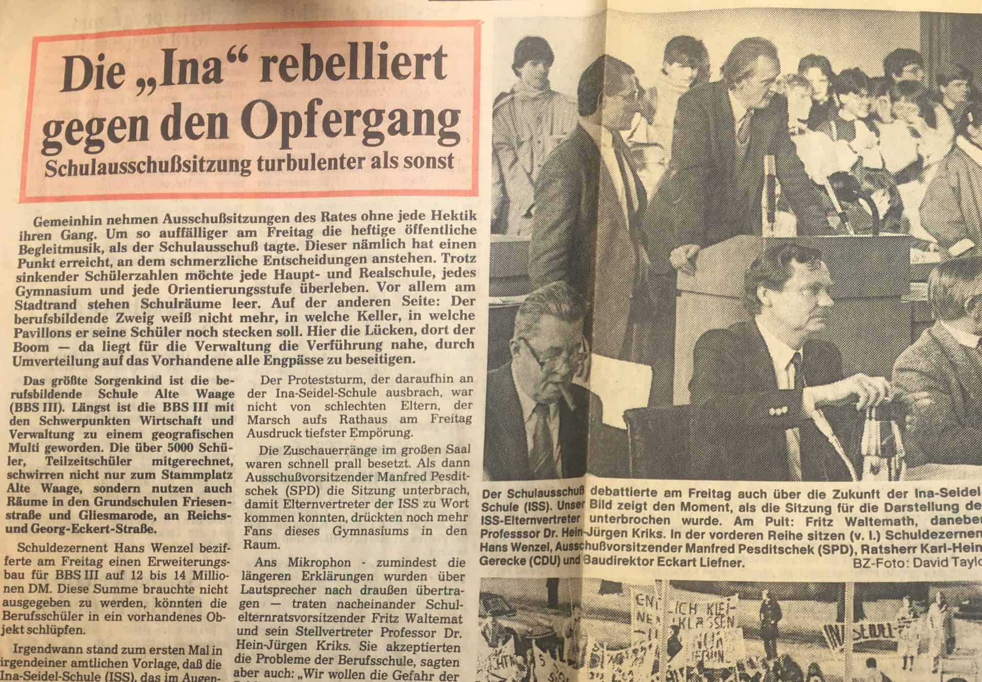 Vergeblich argumentierten der damalige Schulelternratsvorsitzende Fritz Waltemat und sein Stellvertreter Heinz-Jürgen Kriks. Sie akzeptierten wohl den Bedarf der BBS III, kritisierten aber die Pläne der Politik. „Wir wollen die Gefahr der Schließung nicht von unserer weg auf eine andere schieben. Vielmehr sind wir der Überzeugung, dass zur Lösung der Raumprobleme der BBS III überhaupt keine Schule geschlossen werden muss“, sagten sie. Auch sie konnten die längst gefallene Entscheidung nicht mehr umkehren. Die Ina-Seidel-Schule, als jüngstes Gymnasium der Stadt, musste dran glauben. In Rede stand seinerzeit anfangs noch die Schließung der Hoffmann-von-Fallersleben-Schule, immerhin auch schon 1876 gegründet.