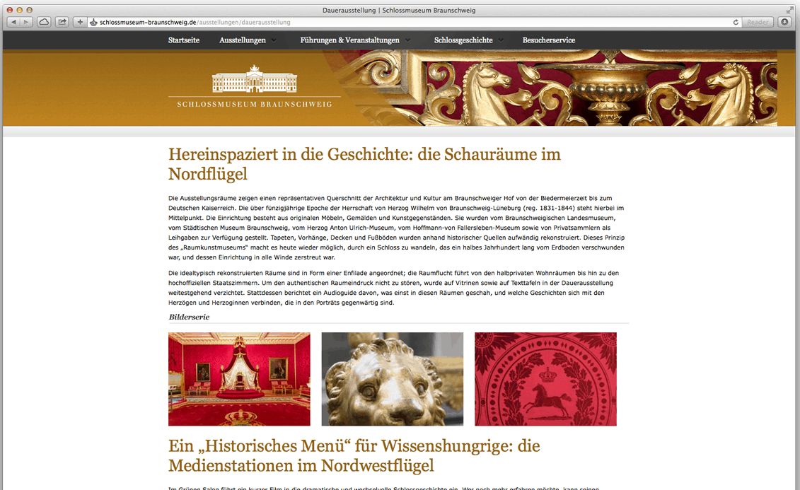 Das Schlossmuseum Braunschweig hat unter www.schlossmuseum-braunschweig.de einen attraktiven, eigenen Internetauftritt bekommen. Vorbei sind damit die Zeiten, in denen Informationen über das Museum lediglich auf der Homepage der Stadt zu finden waren und das Schlossmuseum dort eines von vielen war. Die Internetseite unterstreicht die Eigenständigkeit des Museums in der Braunschweiger Museumslandschaft und das Besondere am Schlossmuseum. Der edle Auftritt macht neugierig auf einen Besuch der Ausstellungen im Nordflügel des rekonstruierten einstigen Welfenschloss.