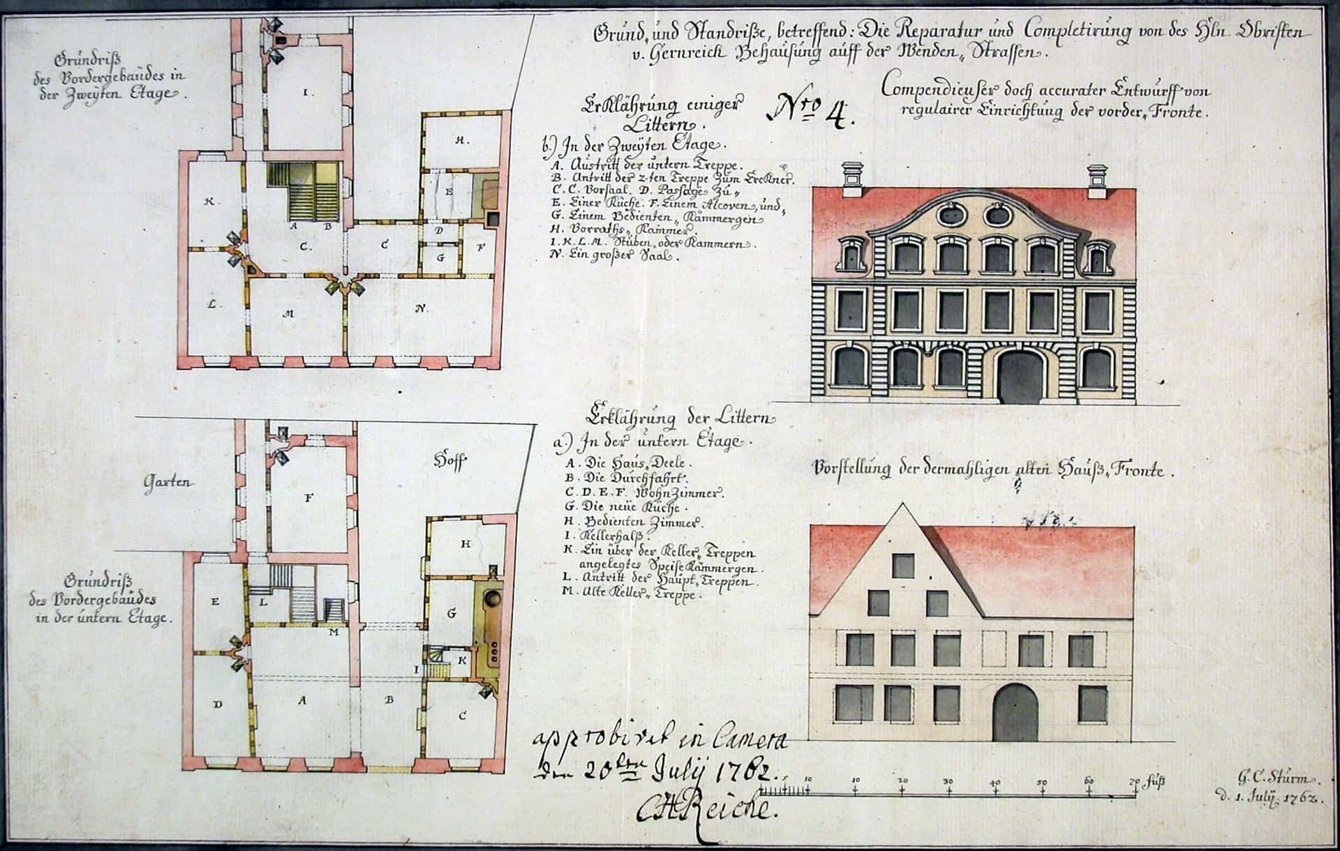 Ebenfalls als Umbau mittelalterlicher Bausubstanz präsentierte das unweit des Hagenmarktes gelegene Haus Wendenstraße 5. Die 1762 entstandene Bauzeichnung Sturms überliefert neben seinem Fassadenentwurf auch den Vorzustand – ein ehemaliges Giebelhaus mit seitlichem Durchfahrtstrakt. Auch dort blieb die mittelalterliche Grundstruktur mit Kemenate bis 1944 erhalten. Der barocke Umbau erfolgte für den Obersten von Gernreich, wobei die Straßenfront weitaus schlichter ausfiel als der engagierte Entwurf Sturms. Die seitliche Lage der Torfahrt sollte durch Fassadengliederung ausgeglichen werden.
