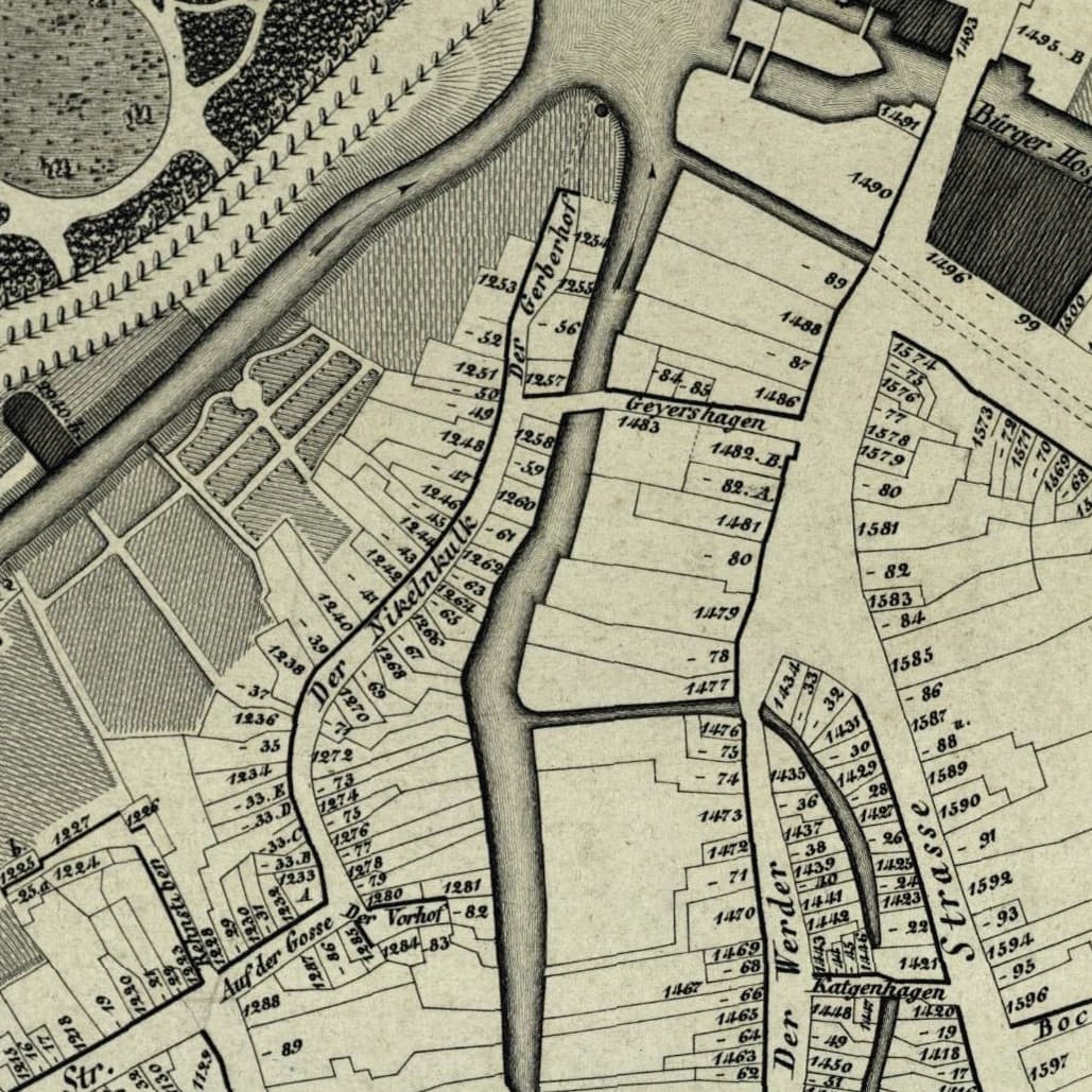 Er zweigte von der Kaiserstraße ab, verlief mit zweifachem Schwung in Richtung Nordwesten und endete in einer Sackgasse. Diese Gasse, der ursprüngliche Gerberhof, lag am Zusammenfluss von Bosselgraben und innerstädtischem Okerlauf. Eine kurze Stichstraße, der Geiershagen, führte dort über den Okerlauf auf die Wendenstraße im Weichbild Hagen. Auch diese Straße ist in ihrem einstigen Verlauf im Stadtbild nicht mehr vorhanden. Ihre ebenfalls aufgehobene Bezeichnung lebt jedoch fort mit dem Neuen Geiershagen, einem Fußweg zwischen Jugendherberge und Inselwall. Seine Namensgebung geht auf eine Anregung des Verfassers zurück.