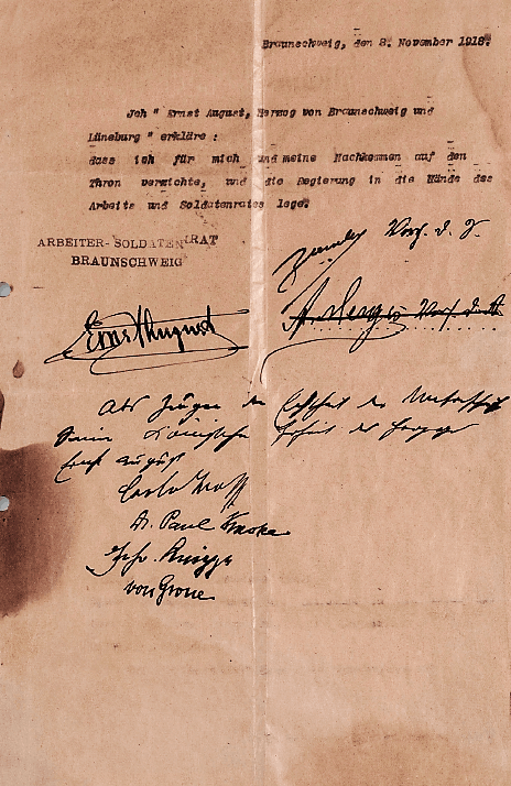 Revolutionsführer August Merges hatte auf der Urkunde zunächst seine Unterschrift gestrichen. So ist es auf dem Faksimile zu sehen. Später hat Merges die Streichung auf dem Original mit einer Unterpunktion wieder rückgängig gemacht. Das zeigt das Original. Die Gründe, weshalb Merges seinen Namen wieder durchstrich, sind unklar. Eine Version: Ernst August habe gefordert, nur einem Militärangehörigen gegenüber abzudanken. Der Vorsitzende des Soldatenrates Paul Zander, der jedoch nicht der Delegation im Schloss angehörte, hatte bereits unterzeichnet.