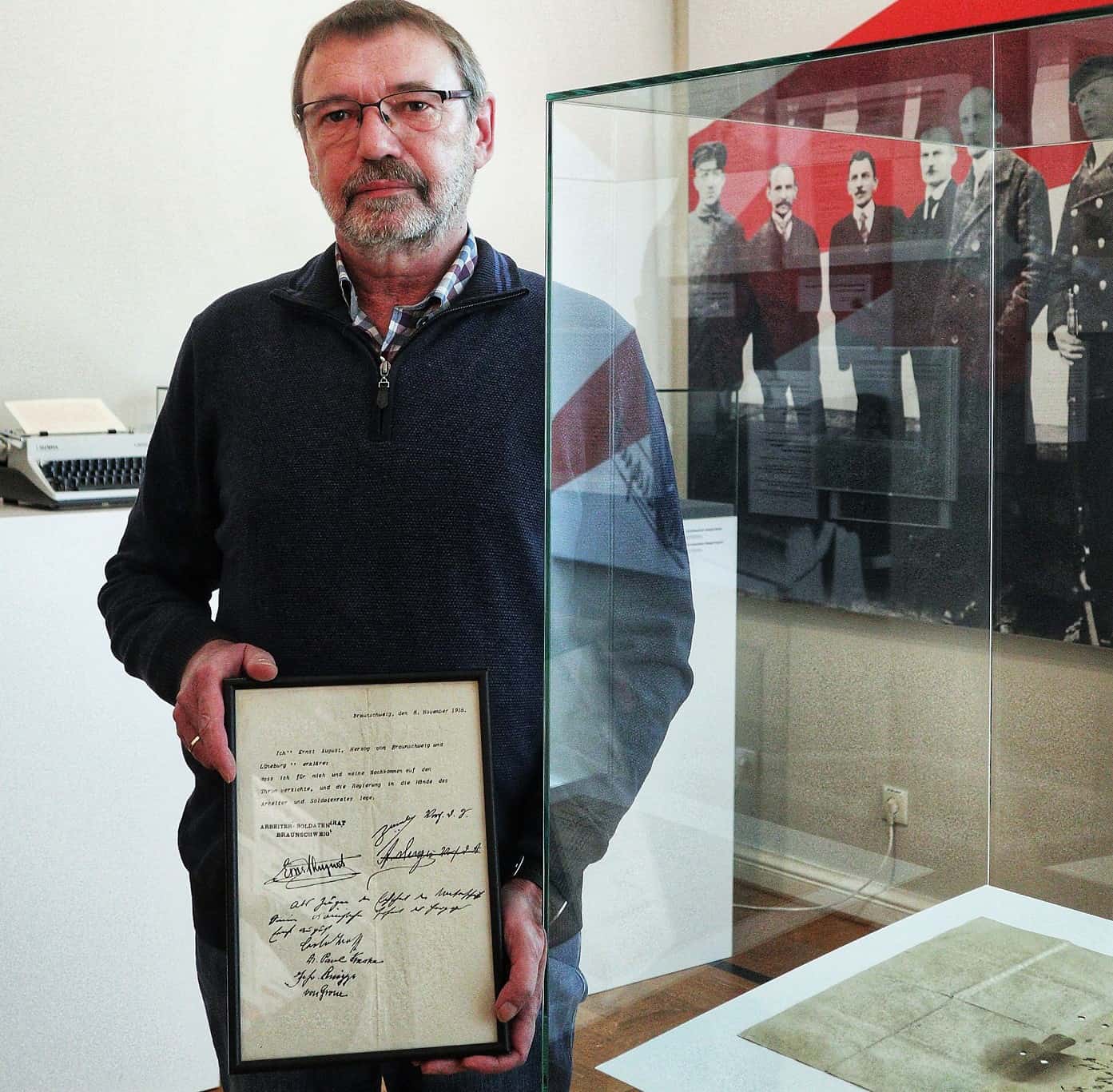 Die Berichterstattung über die Ausstellung und die Abbildung der Abdankungsurkunde führte Harald Schwedhelm ins Schlossmuseum. „Das in der Zeitung abgebildete Dokument ähnelte stark einem Blatt aus dem Nachlass meines Großvaters Richard“, schildert der 61-jährige. Um das geerbte Dokument mit dem Original zu vergleichen, besuchte er die Sonderausstellung. Tatsächlich handelt es sich bei dem Schriftstück um ein Faksimile der Abdankungsurkunde.