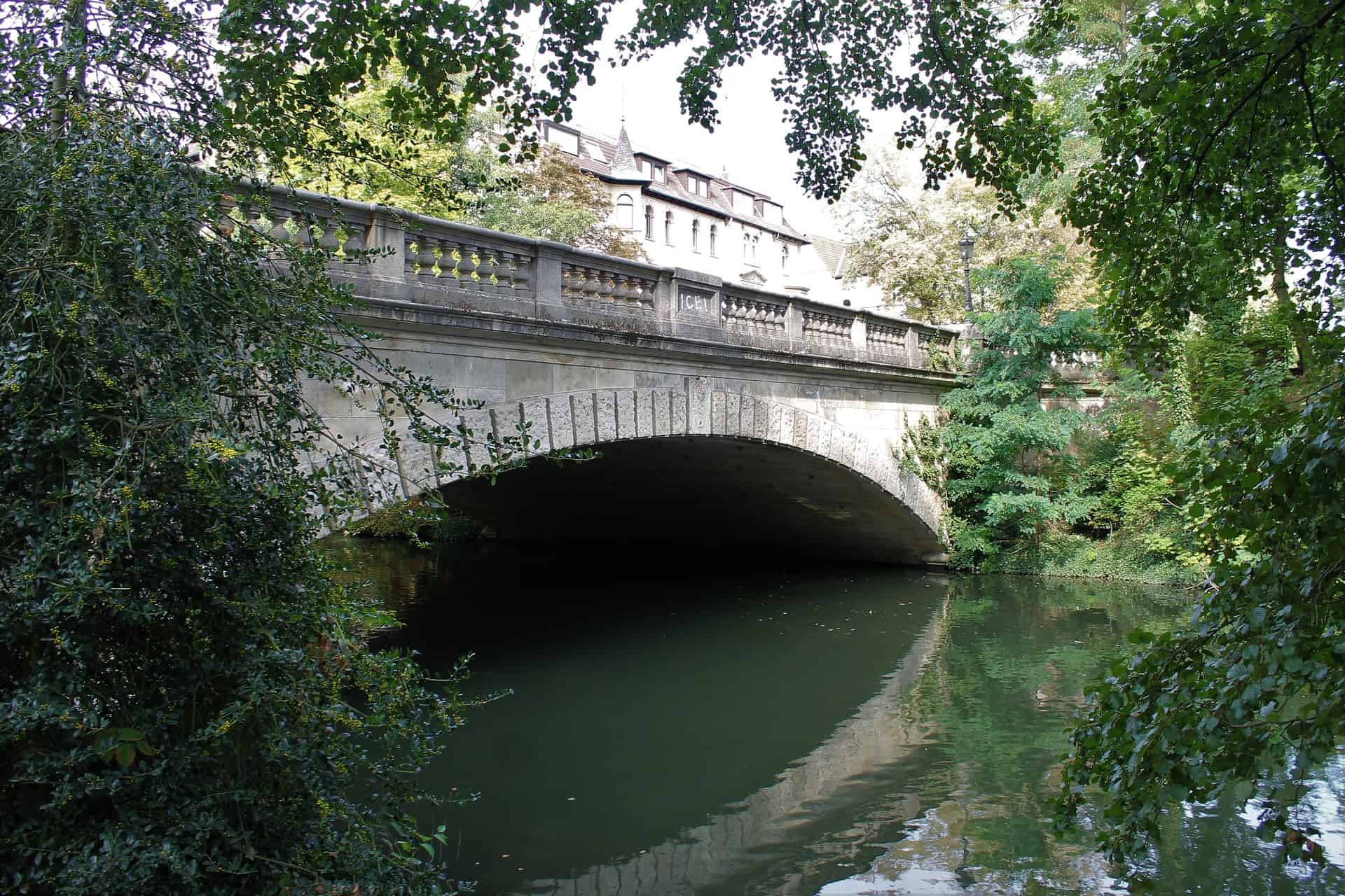 Sie ist eine in Werkstein­mau­er­werk errich­tete Bogen­brücke mit viertel­kreis­förmig ausschwin­genden Wider­la­gern. Auf der Stadt­seite besteht ein doppel­bo­giger Durchgang für Fußgänger. „Großfor­ma­tige Stein­quader mit tiefen Fugen und rauer Oberfläche betonen die Pfeiler und Bogen­öff­nungen. Über einem Gesims­profil ist das Geländer als kräftige Balus­trade ausge­bildet. Die Formen­sprache orien­tiert sich an der Renais­sance und dem Barock“, schreibt Bauhis­to­riker Elmar Arnhold.