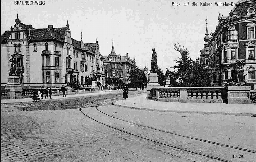 Die Brücke war 1888/89 im Zug der Stadt­er­wei­te­rung um das Östliche Ringge­biet nach einem Entwurf des genialen Stadt­bau­rats Ludwig Winter errichtet worden. Die Brücke führt stadt­aus­wärts in Verlän­ge­rung des Stein­weges um das Staats­theater herum in die Jaspe­r­allee. Die Allee hieß damals „Kaiser-Wilhelm-Straße”. Bis heute ist sie die Haupt­achse der östlichen Stadt­er­wei­te­rung aus dem späten 19. Jahrhun­derts. Die Planung der Erwei­te­rung stammte ebenfalls von Winter. Die „Kaiser-Wilhelm-Straße”, die nach der Revolu­tion 1918 eine Zeitlang Friedens­allee hieß, und ihr Umfeld waren für Angehö­rige der höheren Bevöl­ke­rungs­schichten angelegt. Für sie sollte mit der neuen Brücke ein angemes­sener Auftakt geschaffen werden. Diese nach dem damaligen Staats­ober­haupt „Kaiser-Wilhelm-Brücke” genannte Fluss­über­gang ist eine der in den „Gründer­jahren” (1871–1914) neu angelegten Okerbrü­cken.
