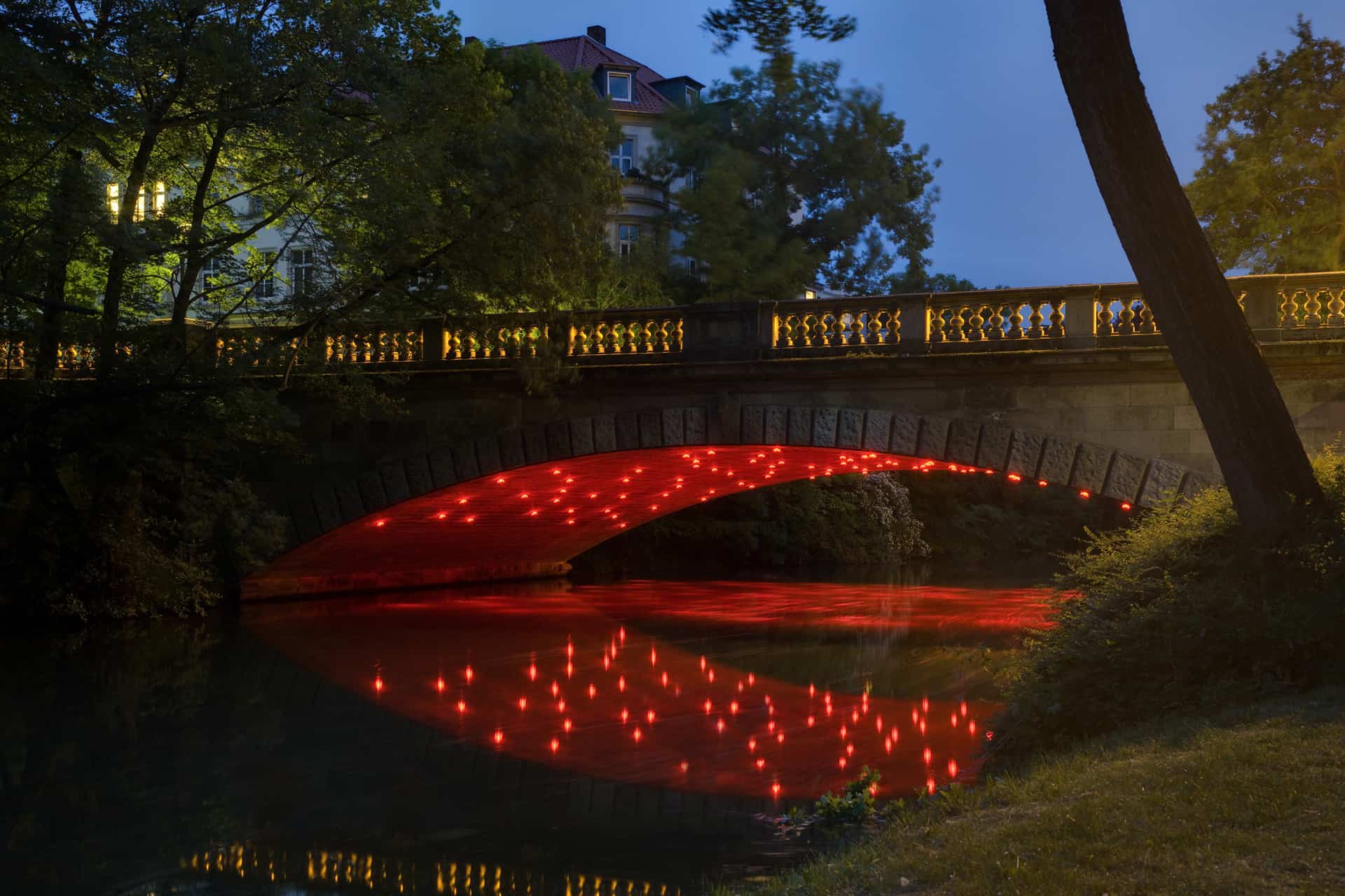 Immerhin erlangte die abgeschmückte Brücke der Jaspe­r­allee noch einmal durch den Licht­par­cours 2008 künst­le­ri­sche Berühmt­heit über die Stadt­grenzen hinweg, als die Künst­lerin Yvonne Goulbier die Brücke in rotes Licht tränkte und das Ganze „Evokation in Rot“ taufte. 150 in Blüten­form gestal­tete, rot-leuch­tende LED-Lampen und 250 gelbe hatte die Hanno­ve­ra­nerin montiert. Die Leucht­kraft wurde von der Oker wider­ge­spie­gelt. Die atmosphä­risch ins rechte Licht gerückte Theater­brücke war ein Höhepunkt des Licht­par­cours.  Als Ensemble mit dem Braun­schwei­gi­schen Staats­theater machte die Licht­in­stal­la­tion Braun­schweig alle Ehre, so dass sie auch 2010 noch einmal bei der nächsten Auflage des Licht­par­cours erstrahlte.