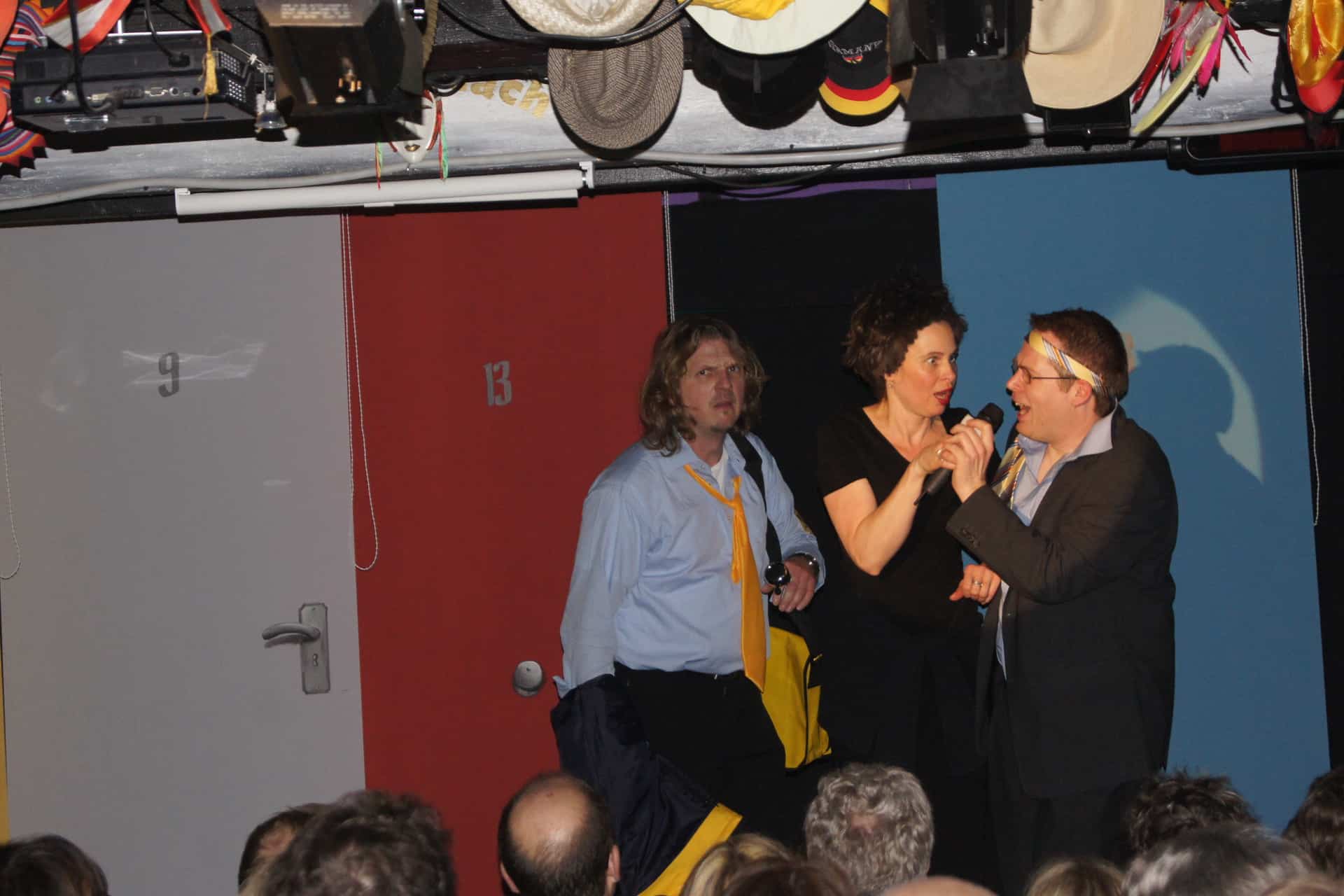Jedoch sächseln nicht nur die acht Schau­spieler, die in 21 Rollen schlüpfen. Auch das Publikum macht mit, indem es mit den Darstel­lern sächsisch lernt. Und das geht so: Die Vokabeln werden über Lautspre­cher einge­spielt und ein Leucht­band über der Bühne fordert die Zuschauer auf „Bitte laut mitspre­chen!“