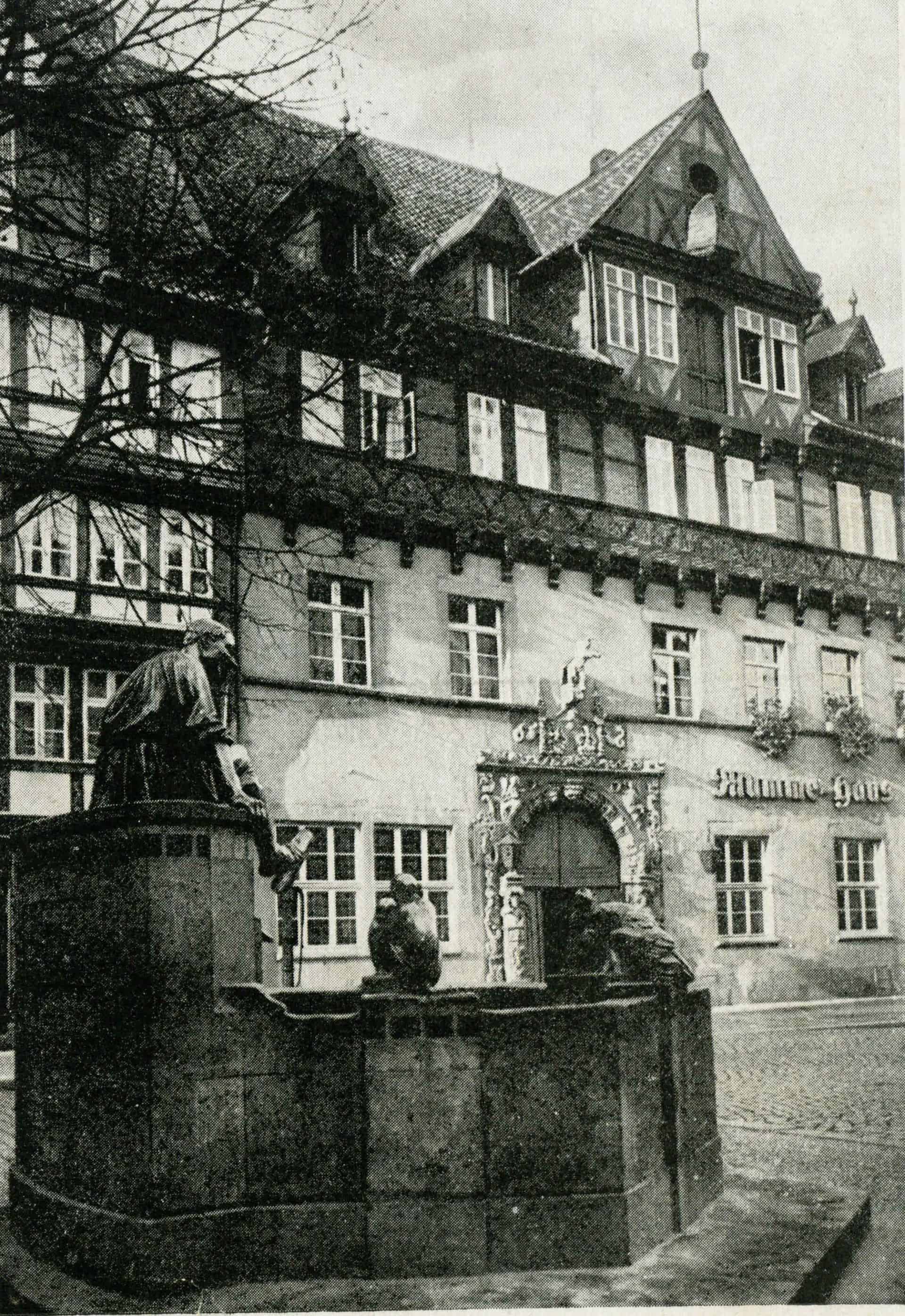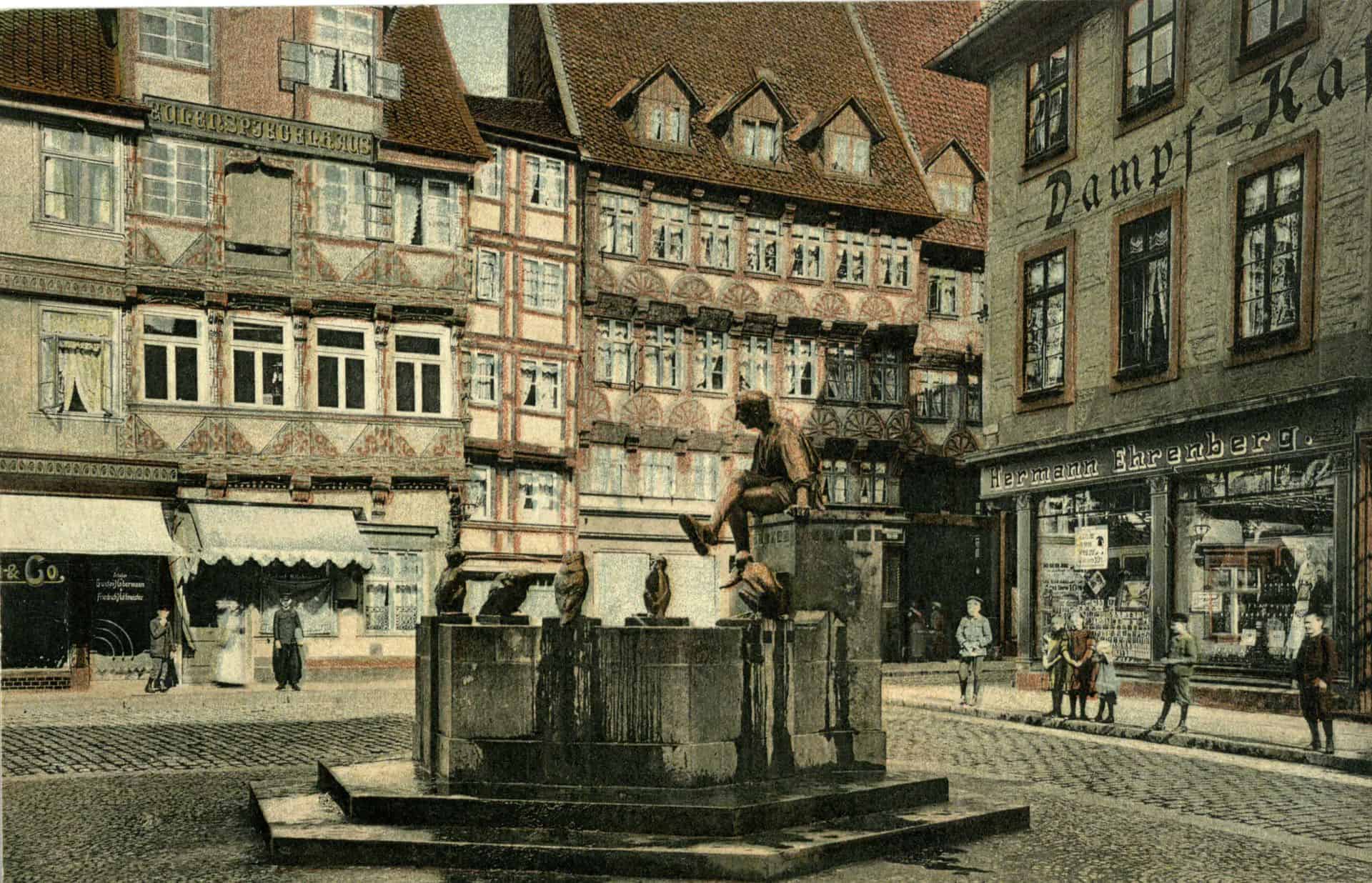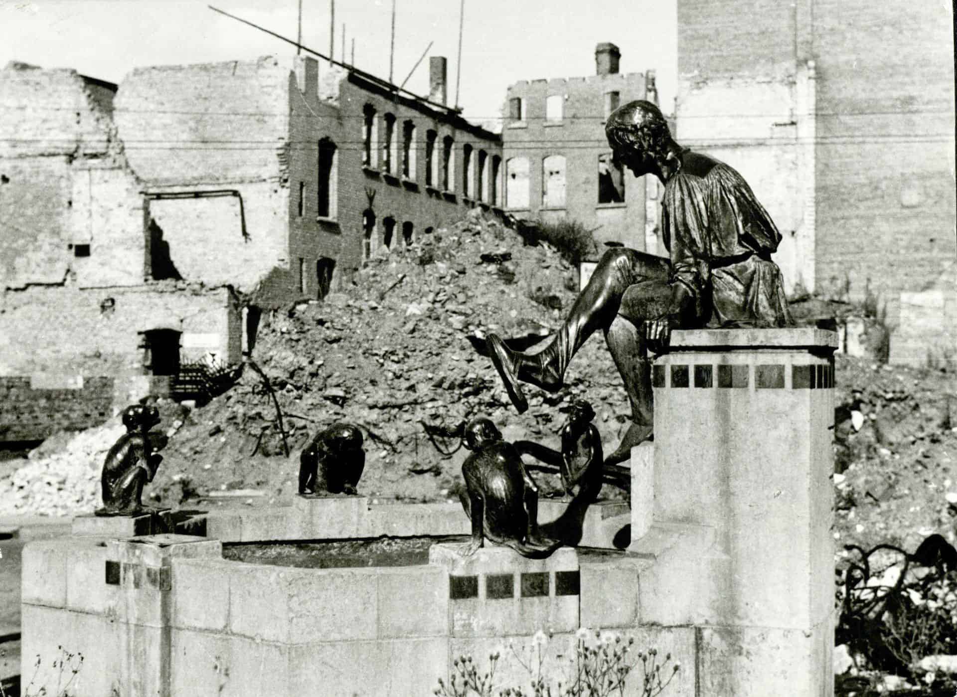Wie durch ein Wunder überstand der Brunnen den schweren Bomben­an­griff vom 15. Oktober 1944, dem die wunder­baren Fachwerk-Häuser drumherum samt und sonders zum Opfer fielen. Die Bilder in dem Buch belegen die damalige Schönheit des Quartiers rund um den Eulen­spie­gel­brunnen.