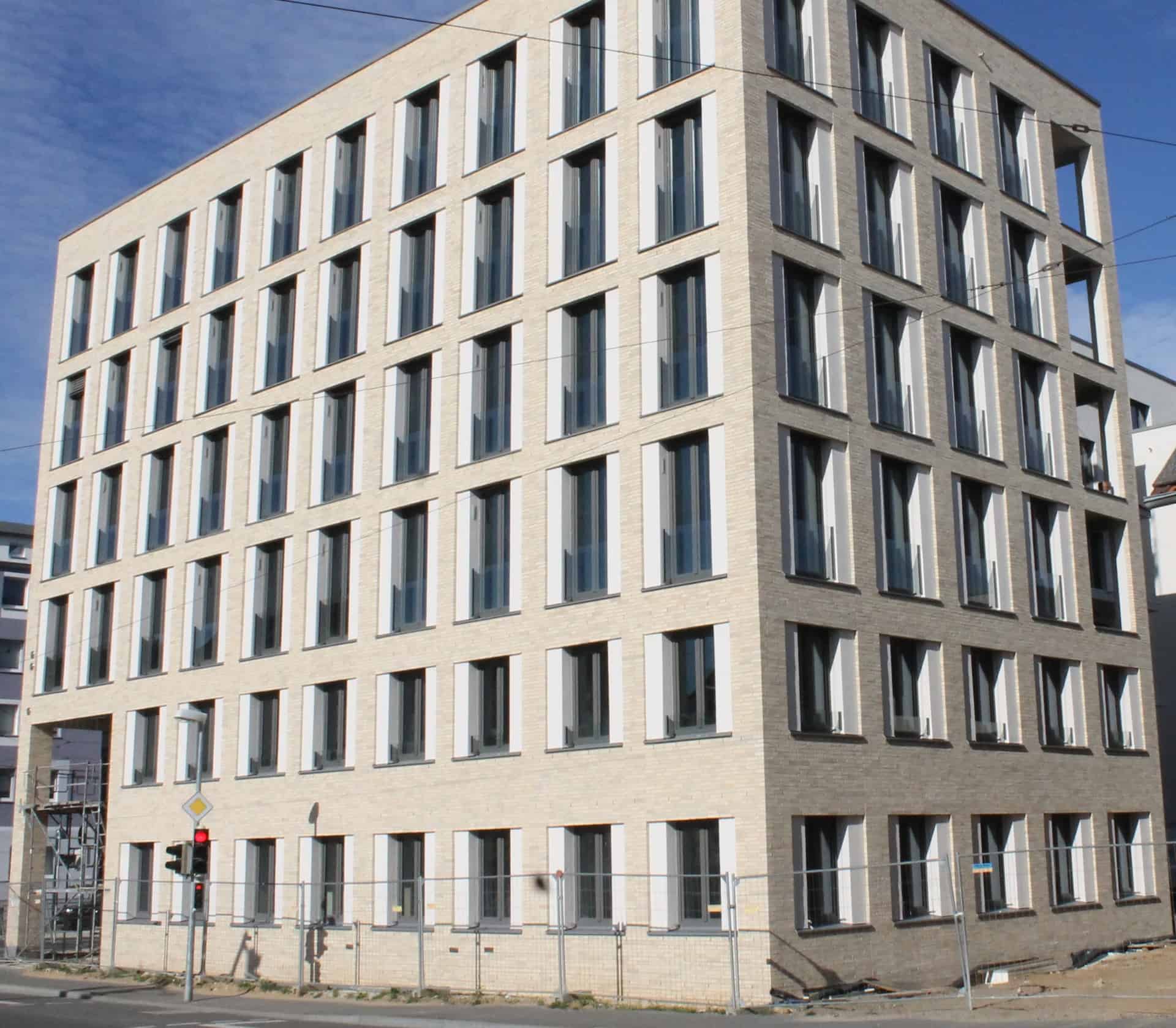 Die stadt­bild­prä­gende Wirkung des Eckhauses Leonhardstraße/Leonhardplatz am Quartier St. Leonhard ist nach dem Abbau des Bauge­rüsts deutlich zu erleben. Die sicht­baren Vollklinker-Fassaden des Gebäudes werten die städte­bau­liche Situation erheblich auf. Das Haus fasst den Platz mit seiner großen Straßen­kreu­zung dank seiner stimmigen Dimension im Verhältnis zu den Bestands­bauten neu und gibt ihm endlich Halt.