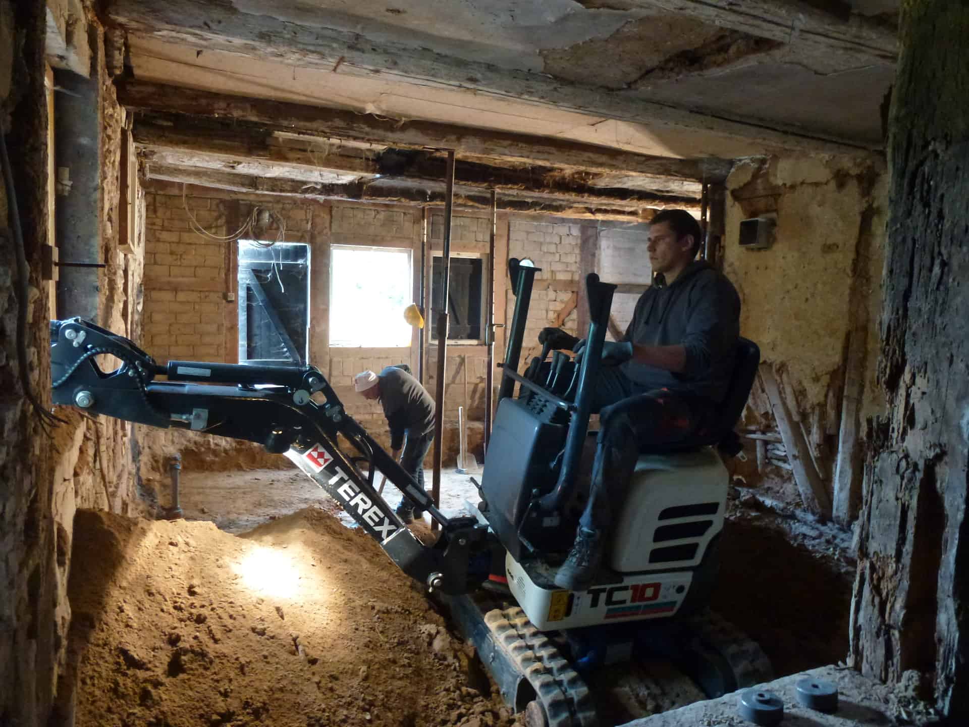 „Es ist so viel wie möglich an histo­ri­scher Bausub­stanz erhalten geblieben“, versi-chert Bernd Hoppe-Dominik. Schon am Eingang weist er auf altes Holzfach­werk. Die Mehrzahl der tragenden Balken musste freilich ersetzt werden. Der Stein­fuß­boden von anno dazumal war zunächst abgetragen worden, damit eine Beton­bo­den­platte gegen die Feuch­tig­keit gegossen werden konnte – heute liegt er wieder. Gereinigt, aber authen­tisch. Es gibt weitere histo­ri­sche Zitate, wie etwa einen Treppen­ab­gang, der von oben mit Sicher­heits­glas abgedeckt ist. Ganz früher führte er wohl in einen Kühlraum, in dem die geschos­senen Enten gelagert wurden. Erhalten wurde auch ein Stück Wand, das ebenfalls mit Glas geschützt ist, aber die Ferti­gungs­struktur aus Holz, Lehm und Stroh sichtbar lässt.