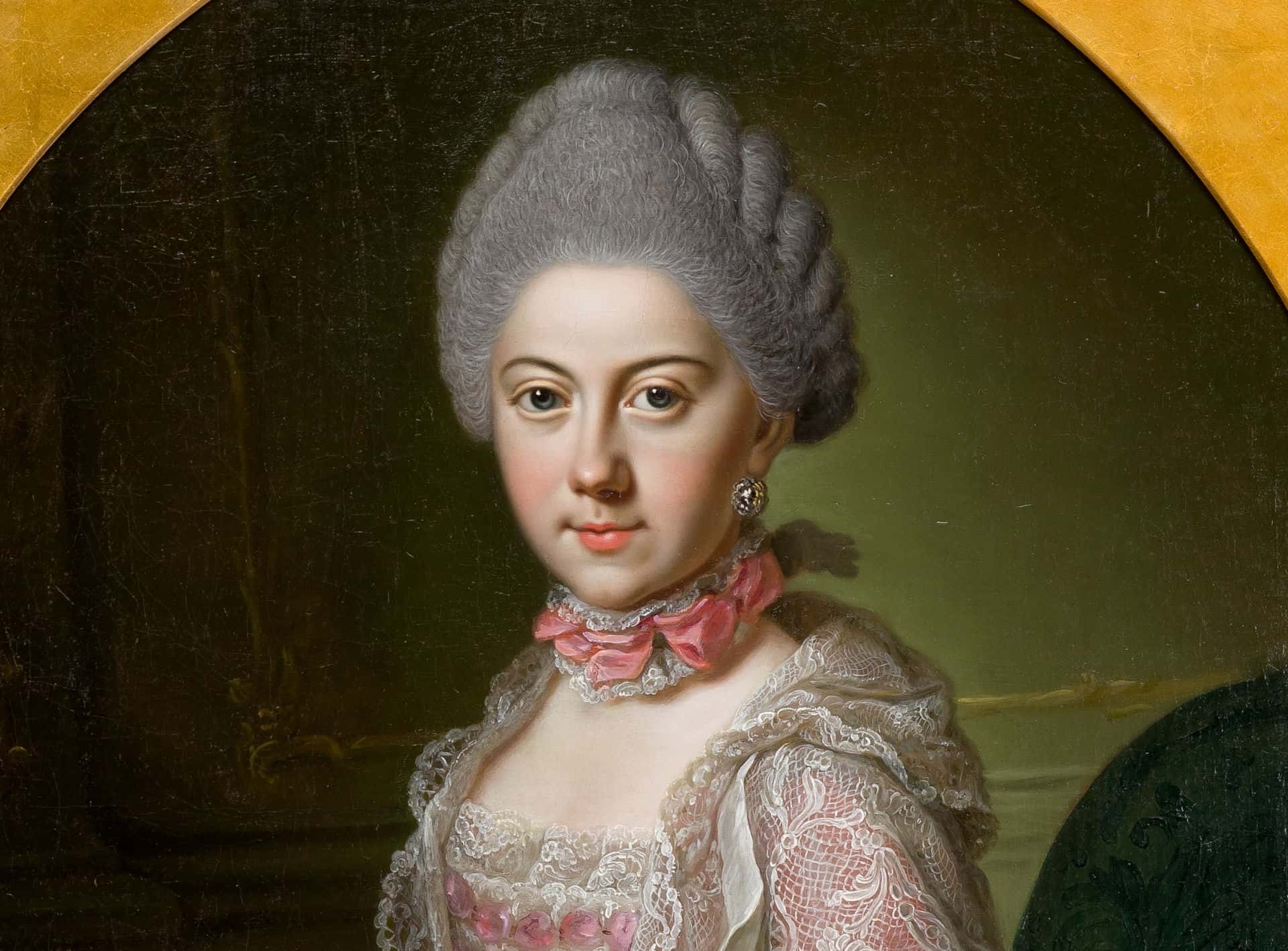 Am 2. Oktober 1749 wurde Augusta Dorothea in Schloss Wolfen­büttel geboren. Sie war die jüngste der sechs Töchter von Herzog Carl I. Die leicht kräftige Partie von Nase und Augen weist auf die Verwand­schaft hin. Ein ovales Gesicht, rundliche Wangen, leicht gerötet, ein feiner Mund und wache, neugie­rige Augen zeigen uns die Prinzessin im Alter von wohl 19 Jahren. Unver­mit­telt schaut sie uns an und unter­bricht für einen Augen­blick ihre auch am Braun­schwei­gi­schen Hof typisch weibliche Beschäf­ti­gung, die Fein- oder Filet­sti­ckerei: die Häkel­na­deln in den schlanken Händen, das feine trans­pa­rente Gewebe aufge­wi­ckelt an einer Spindel am Tisch, daneben ein schon fertiges Spitzen­ta­schen­tuch.
