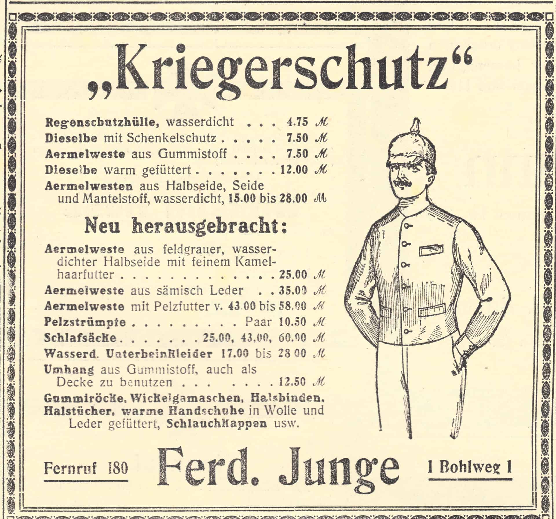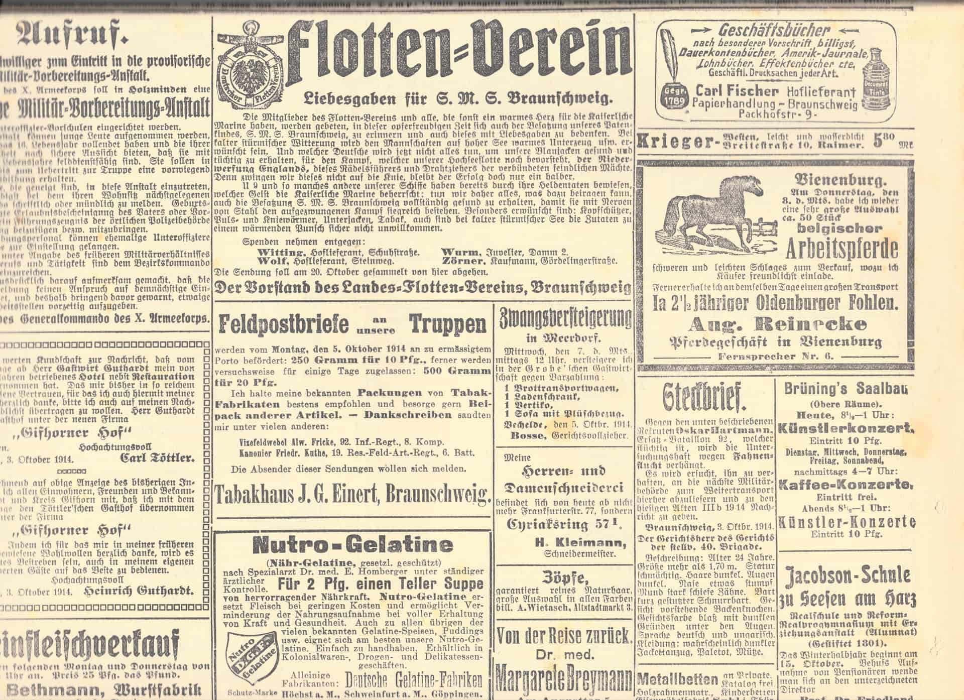Die Zeitung „Braunschweiger Allgemeiner Anzeiger – Verbreitetste Braunschweiger Zeitung” rief zu einer Sammlung der besonderen Art auf: Sie bat um Spenden von „Ferngläsern und Pistolen für Unteroffiziere”. In Anzeigen boten Braunschweiger Geschäfte wetterfeste, warme Kleidung für den Schützengraben an sowie Köstritzer Schwarzbier als Nähr- und Kraftbier für die verwundeten Krieger.