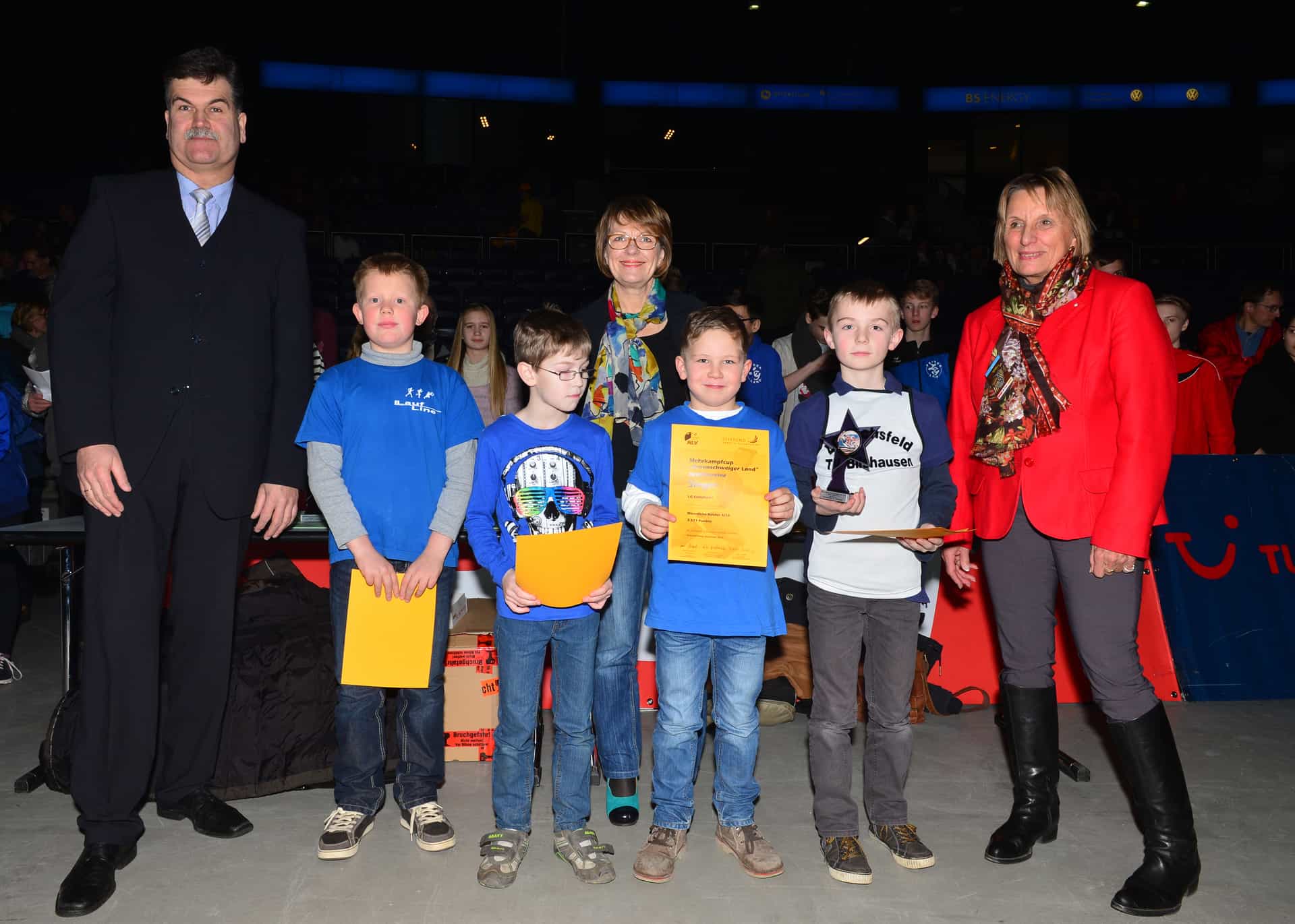 Am 25. Januar 2014 wurden 100 Sieger anläss­lich der Sport­ver­an­stal­tung „Feuerwerk der Turnkunst“ in der Volks­wagen Halle in Braun­schweig geehrt. Den Sonder­preis für die teilneh­mer­stärkste Schule gewann das Gymnasium Salzgitter-Bad, das 699 Schüle­rinnen und Schüler für die Wettkämpfe gemeldet hatte. „Die 14. Veran­stal­tung war für mich eine gelungene Premiere und macht Lust auf mehr. Der Rahmen mit über 5.000 Zuschauern in der Volks­wagen Halle würdigte die tollen Leistungen unserer jungen Leicht­ath­leten“, zog Viktoria Leu, Referentin Breiten­sport und Sport­ent­wick­lung beim NLV, eine durchweg positive Bilanz. Aber nicht nur die Besten werden beim beliebten Sport­pro­jekt für die Region ausge­zeichnet; jeder Einzelne erhält entspre­chend seiner Leistung das offizi­elle Mehrkampf­ab­zei­chen des Deutschen Leicht­ath­letik-Verbandes in Gold, Silber oder Bronze und eine Urkunde.