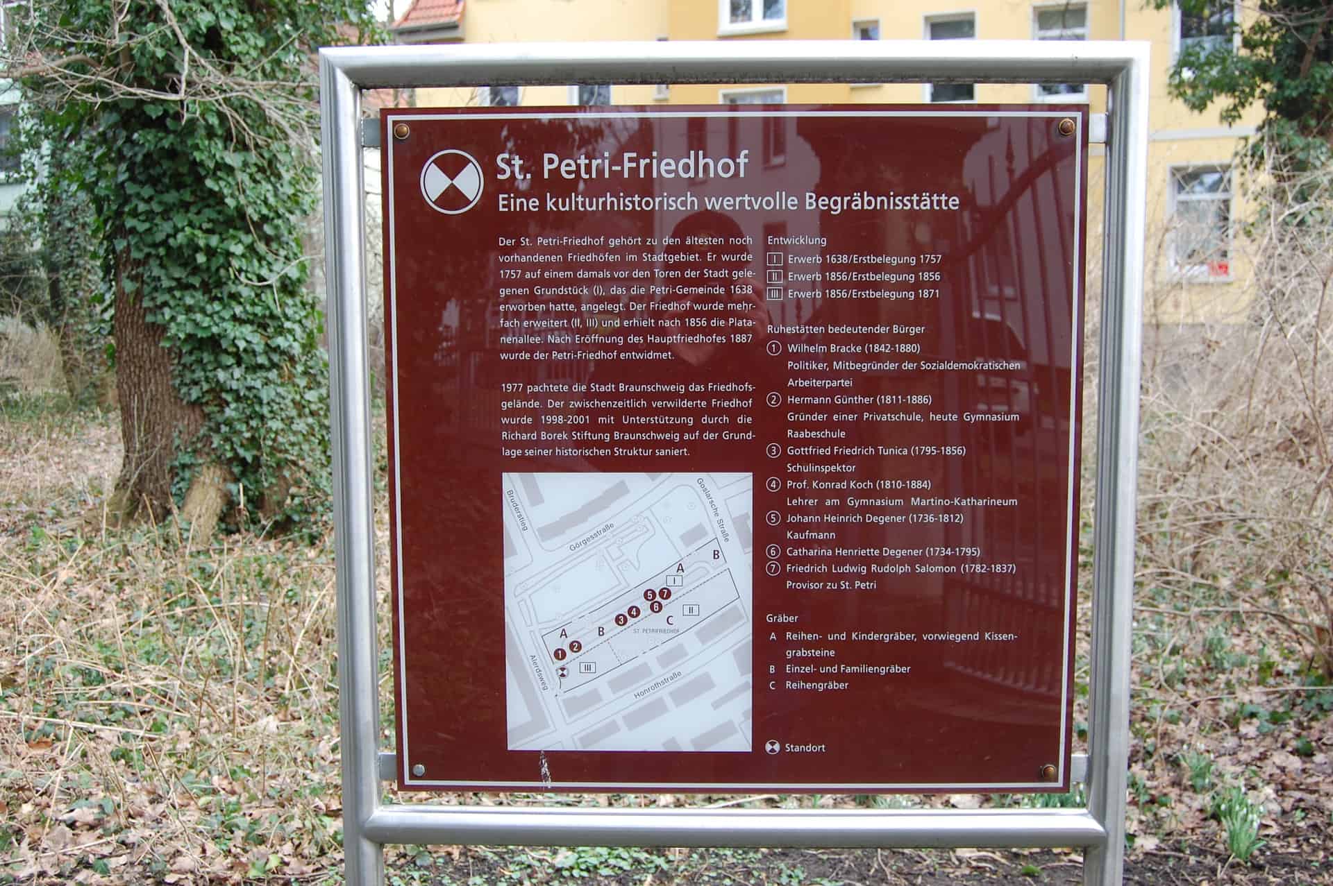 Der St. Petri Friedhof an der Goslarschen Straße zählt zu den ältesten Friedhöfen Braunschweigs im Stadtgebiet. Auf ihm ruhen einige recht berühmte Braunschweiger wie Wilhelm Bracke (1842–1880), Politiker und Mitbegründer der Sozialdemokratischen Arbeiterpartei, oder auch Schulinspektor Gottfried Friedrich Tunica (1795–1856). Auf den Gedenktafeln an den beiden Eingängen zum Friedhof wird auch ein gewisser Prof. Konrad Koch geführt. Er lebte von 1810 bis 1884. Hieß so nicht der Fußballpionier? Auf den Gedenktafeln findet sich kein erläuternder Hinweis dazu. Es steht nur Lehrer am Gymnasium Martino-Katharineum geschrieben.