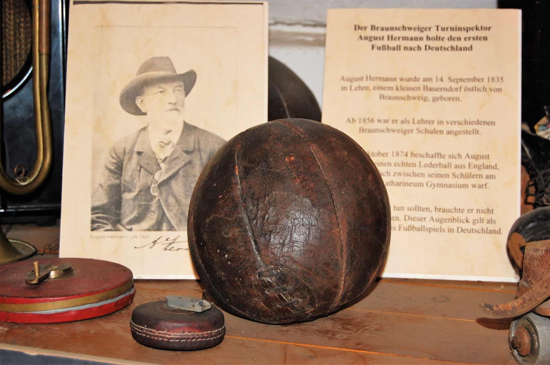 Für skurril halte ich übrigens auch die Debatte, ob der erste Fußball, den Konrad Kochs Kollege, Turnlehrer August Hermann, nach Braunschweig holte, nun rund war oder einem Rugby-Ei glich. Alle historischen Bilder und Zeichnungen zum Thema Fußball zeigen einen runden Ball. Es ist also nicht zu vermuten, dass August Hermann keinen runden, sondern einen länglichen Lederball in unsere Stadt holte. Im Heimatmuseum Lehre wird an den Turnlehrer August Hermann erinnert. Dort ist ein sehr alter Lederball bewundern, der, wie auch die frühen Handbälle, Längsnähte aufweist und rund ist. Das gute Stück in Lehre ist übrigens sehr schwer und „steinhart“ – Leder eben, das häufig benutzt und nass wurde.….