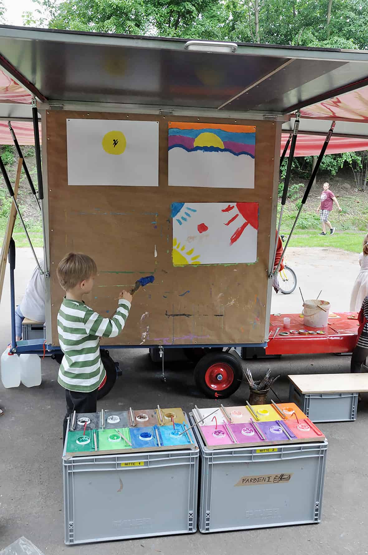 Kaum sind die Koffer geöffnet, kommen die ersten Kinder. Die Auswahl ist groß: es gibt Papier und Pappe, Stifte und Pinsel, Gouache-Farben, Wolle und Stoffreste und Leder, dazu Holzreste und Ton und auch ein Werkzeugkoffer gehören zur Ausrüstung dazu. Sogar Wasser, Handtücher und Malerkittel finden auf dem Wagen Platz. Ein Kunstpädagoge oder eine Kunstpädagogin unterstützt die Kinder und hilft bei gestalterischen und technischen Problemen. Doch es gibt keine Aufgaben, keine Anforderungen und keinen Druck. Jedes Kind kann seine eigenen Ideen entwickeln und umsetzen. „Die KunstKoffer sind ein außerschulisches Bildungsprojekt. Die Kinder können Grunderfahrungen machen und Schlüsselkompetenzen anhand einfacher Materialien in einem offenen Rahmenangebot machen. Sie bilden dabei einen Gegenpol zur technisierten Umwelt“, erklärt Sophia Hamann vom Kunstverein Jahnstraße das Konzept.