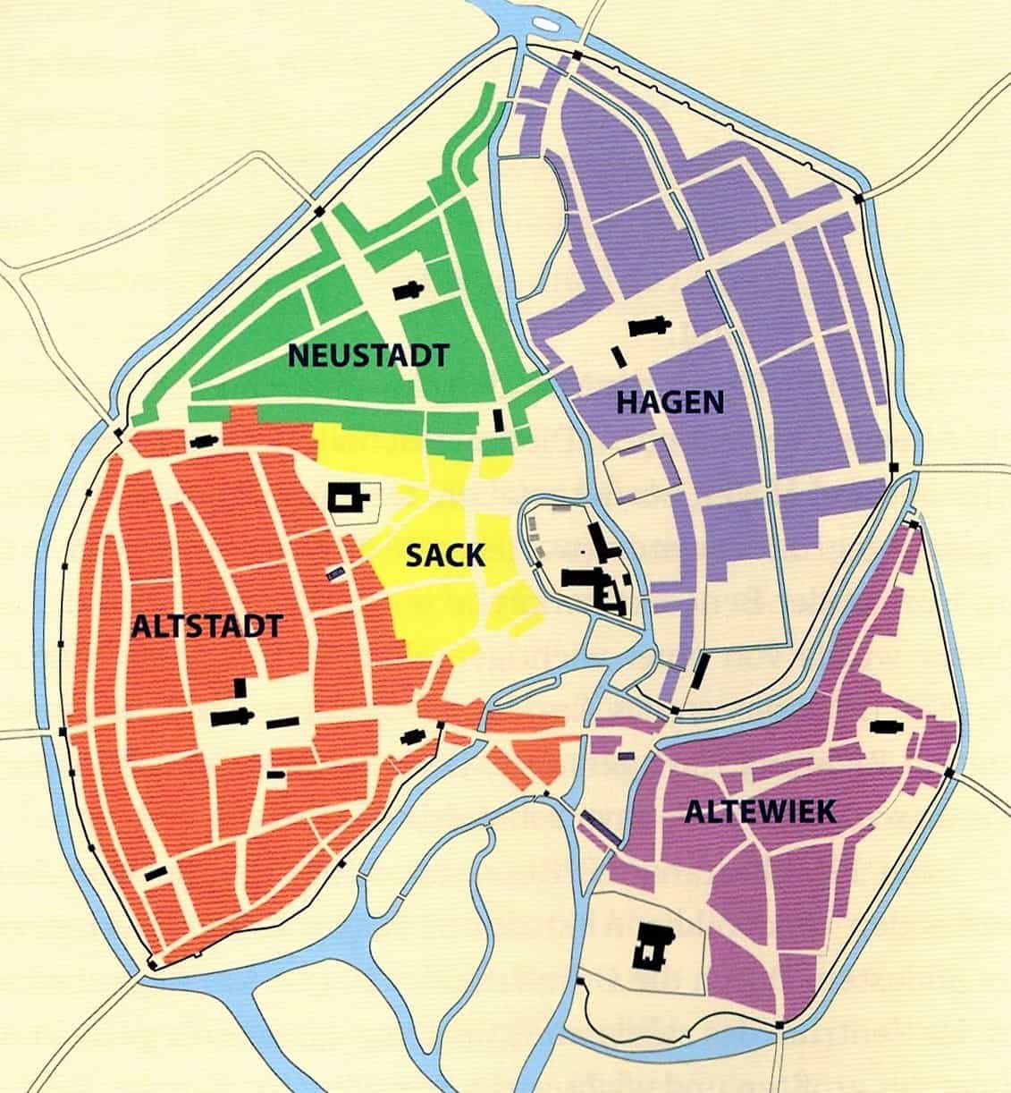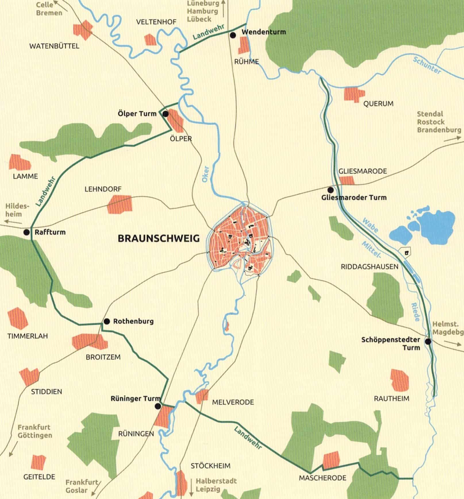 Während die Kirchen und die wichtigsten Profangebäude wie das Altstadtrathaus nach 1945 wiederhergestellt worden seien, habe der alte Stadtkern jedoch eine völlig neue Gestalt erhalten. Ensembles mittelalterlicher und frühneuzeitlicher Wohnbauten seien deswegen nur noch im Umfeld der „Traditionsinseln“ Aegidien, Altstadtmarkt, Burgplatz, Magniviertel und Michaelis erfahrbar. Manche Denkmäler haben die nach den Prämissen moderner Verkehrsplanung erfolgte Neugestaltung nur zufällig überlebt, ein Beispiel dafür sei die Kemenate Hagenbrücke.