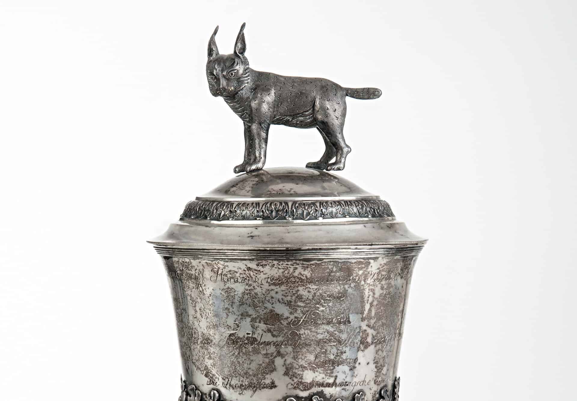 Heute freuen wir uns über die Erfolge des Wieder­an­sied­lungs­pro­jekts für den Luchs im Harz. Es begann zur Jahrtau­send­wende und war das erste seiner Art in Deutsch­land. Rund 200 Jahre zuvor begeg­neten die Menschen im Harz der Raubkatze ganz anders: Sie bejagten sie bis zur völligen Ausrot­tung. Am 17. März 1818 wurde der damals letzte Luchs im Harz erlegt. Förster Speller­berg, der letztlich den tödlichen Schuss abfeuerte, wurde belohnt und erhielt noch sieben Jahre später als Auszeich­nung einen aufwändig gearbei­teten, silbernen Pokal. Er zählt zu den heraus­ra­genden Exponaten der Ausstel­lung „Schatz­kammer Harz“, die vom 5. August 2016 bis zum 3. März 2017  im Schloss­mu­seum Braun­schweig gezeigt wird.