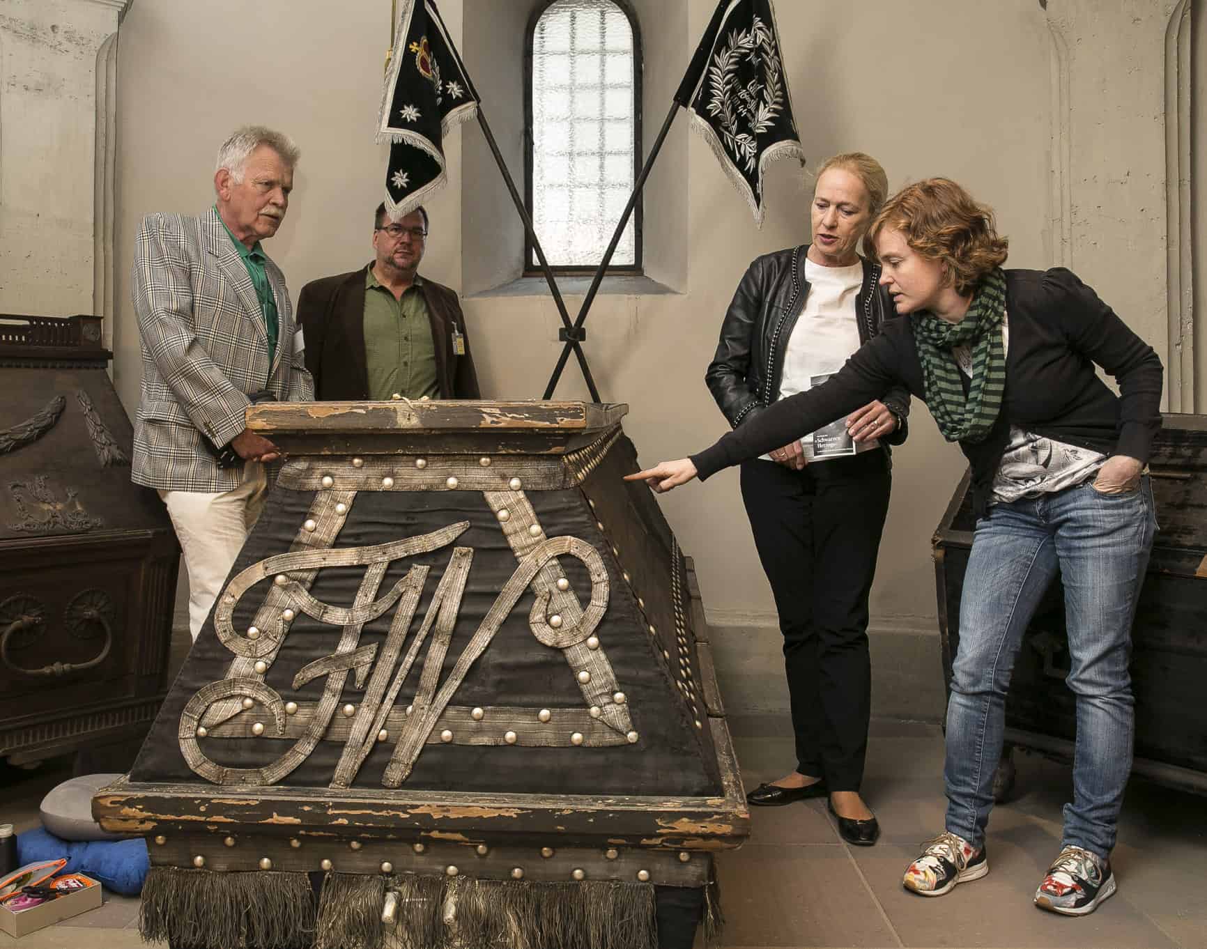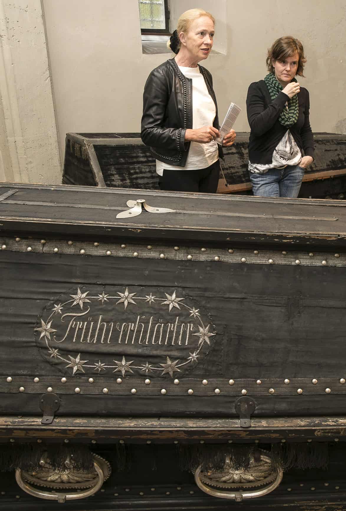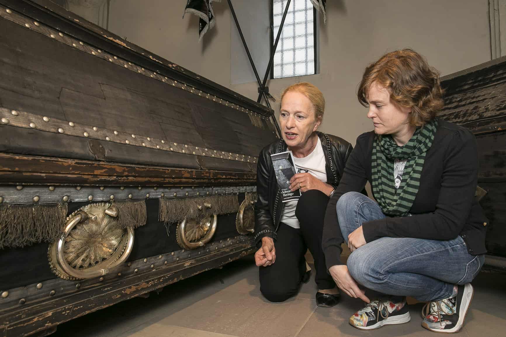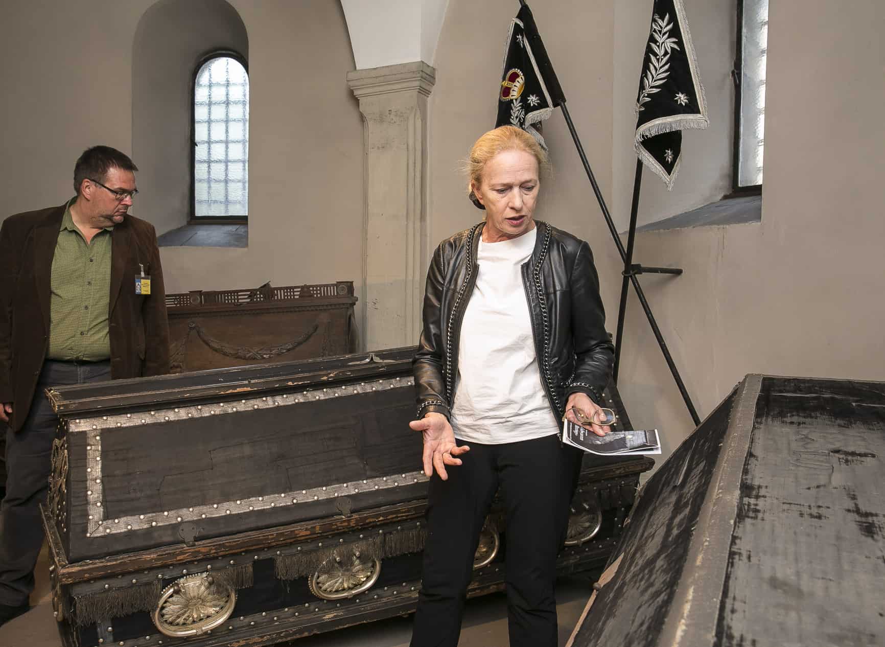 700 Stunden haben die akribischen Textilrestauratorinnen der Paramentenwerkstatt der von Veltheim-Stiftung an dem mit schwarzem Samt überzogenen und reich verzierten Sarg gearbeitet. Er wies erhebliche Schäden auf. Gründe dafür waren jahreszeitliche Schwankungen des Raumklimas und der zeitbedingte Alterungsprozess. Zu allem Überfluss hatten auch Souvenirjäger über die Jahre für erhebliche Fehlstellen gesorgt.