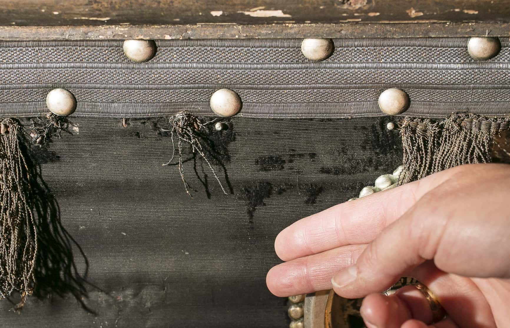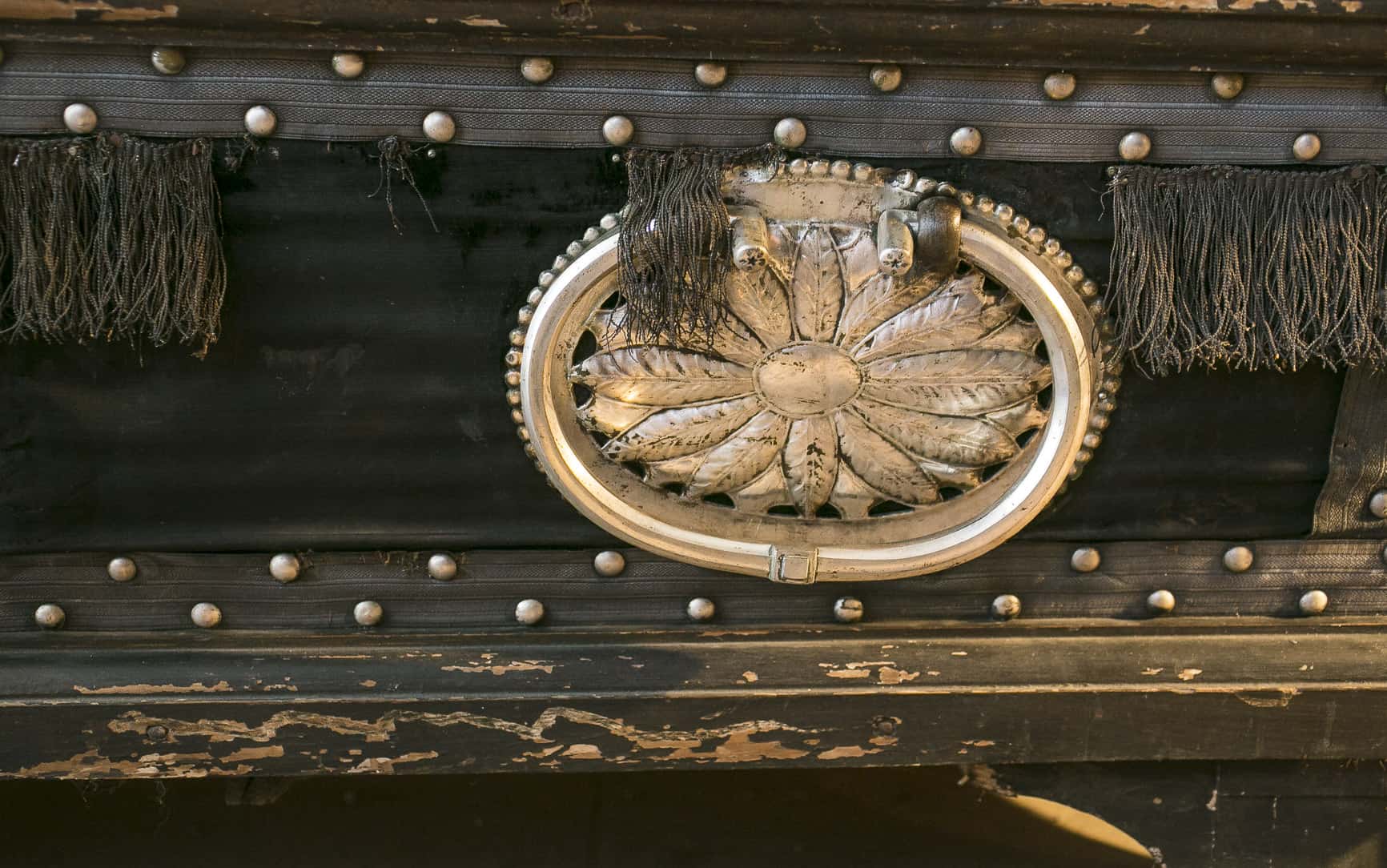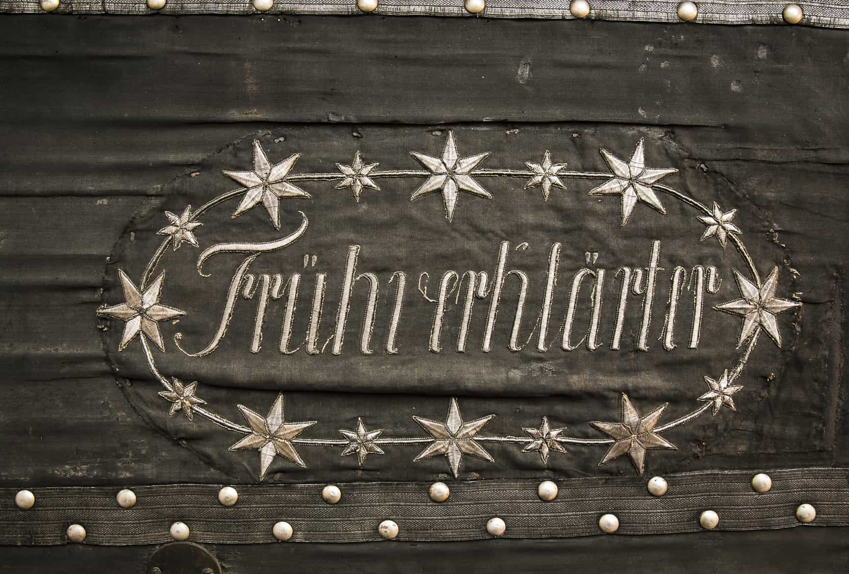 „Wir haben aber die Substanz gesichert und gefestigt. Der Seidenbezug wurde abgenommen gereinigt und neu fixiert. Fehlstellen wurden ergänzt“, berichtet Sabine Kießler von der Arbeit. Die Metallborten wurden nach ihrer Bearbeitung mit Seidengaze überzogen und wieder am Sarg montiert. So konnte so viel möglich der Originalsubstanz erhalten werden.