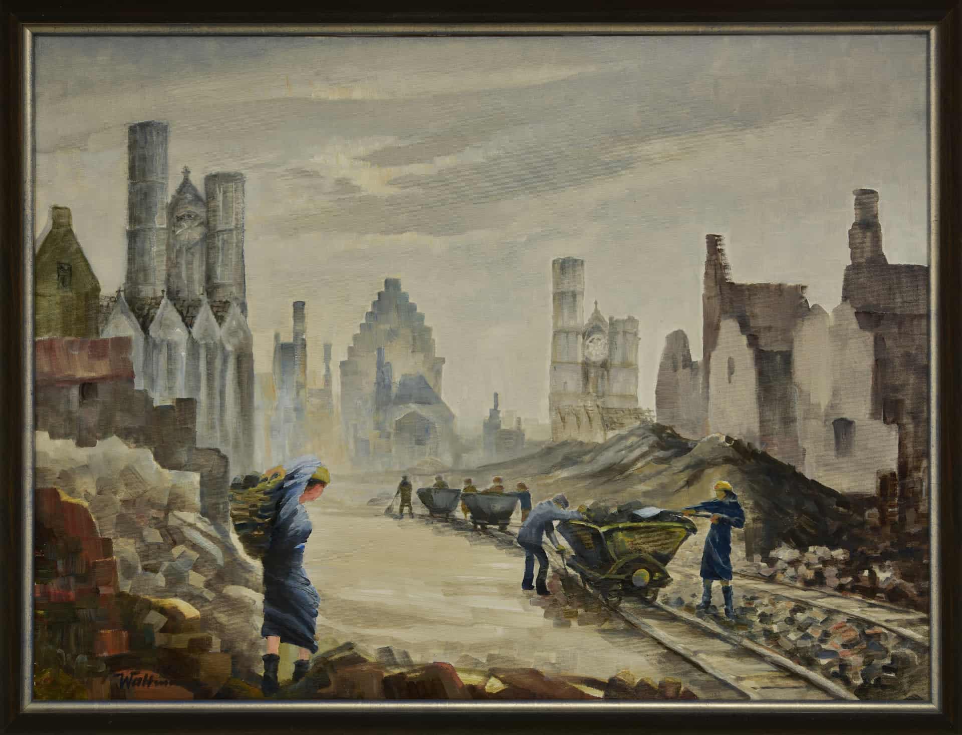Den größten Teil der Ausstellung nehmen Darstellungen ein, die die Stadt als Trümmerlandschaft zeigen. Daneben sind die zerstörten Kirchen zu sehen, der Wiederaufbau, Szenen des Alltags und der romantisch-verklärende Blick auf die Ruinen der Stadt. Im Städtischen Museum werden Aquarelle, Zeichnungen und Druckgraphiken präsentiert. In der Jakob-Kemenate sowie im Bankhaus Löbbecke, im Augustinum und der St. Andreas-Kirche sind es überwiegend Gemälde, in der Kemenate Hagenbrücke werden Zeichnungen des Künstlers Wilhelm Krieg gezeigt.