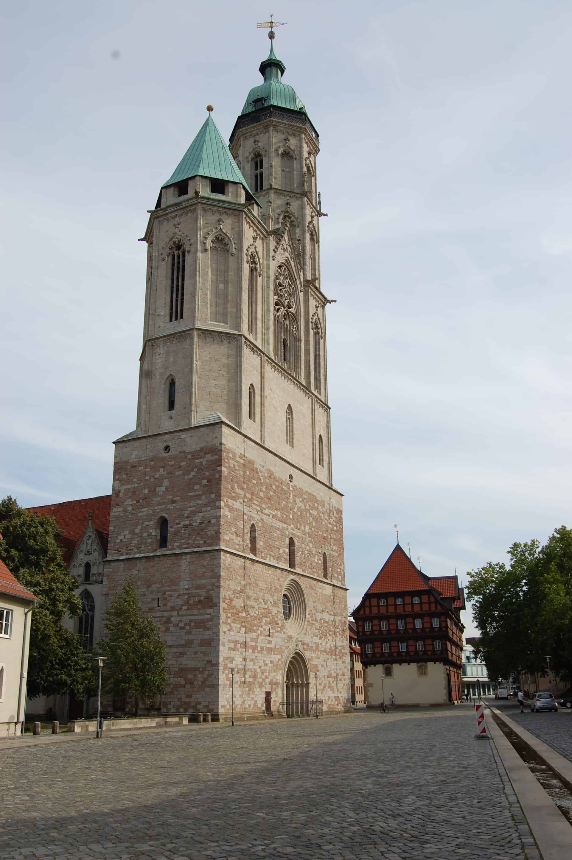 Die Kirche selbst wurde wohl um 1225/30 als vollständig gewölbte Pfeilerbasilika gebaut und hatte zunächst nur drei Langhausjochen, Querhaus, Chorquadrat und drei Apsiden, getreu dem Vorbild, unserem Dom, der Stiftskirche für den Heiligen St. Blasius. Der Westbau wurde um 1250 begonnen, der Umbau zur Hallenkirche begann um 1300 und wurde bis zur Mitte des 14. Jahrhunderts mit dem Langchor fortgesetzt. Die Altarweihe fand dort 1353 statt. Gegen Ende des 14. Jahrhunderts bis zum Anfang des 15. Jahrhunderts erhielten die Joche, mit Ausnahme der Chorapsis, Giebelbekrönungen und Blendmaßwerk (Quelle: Braunschweiger Stadtlexikon, Braunschweig, 1992).
