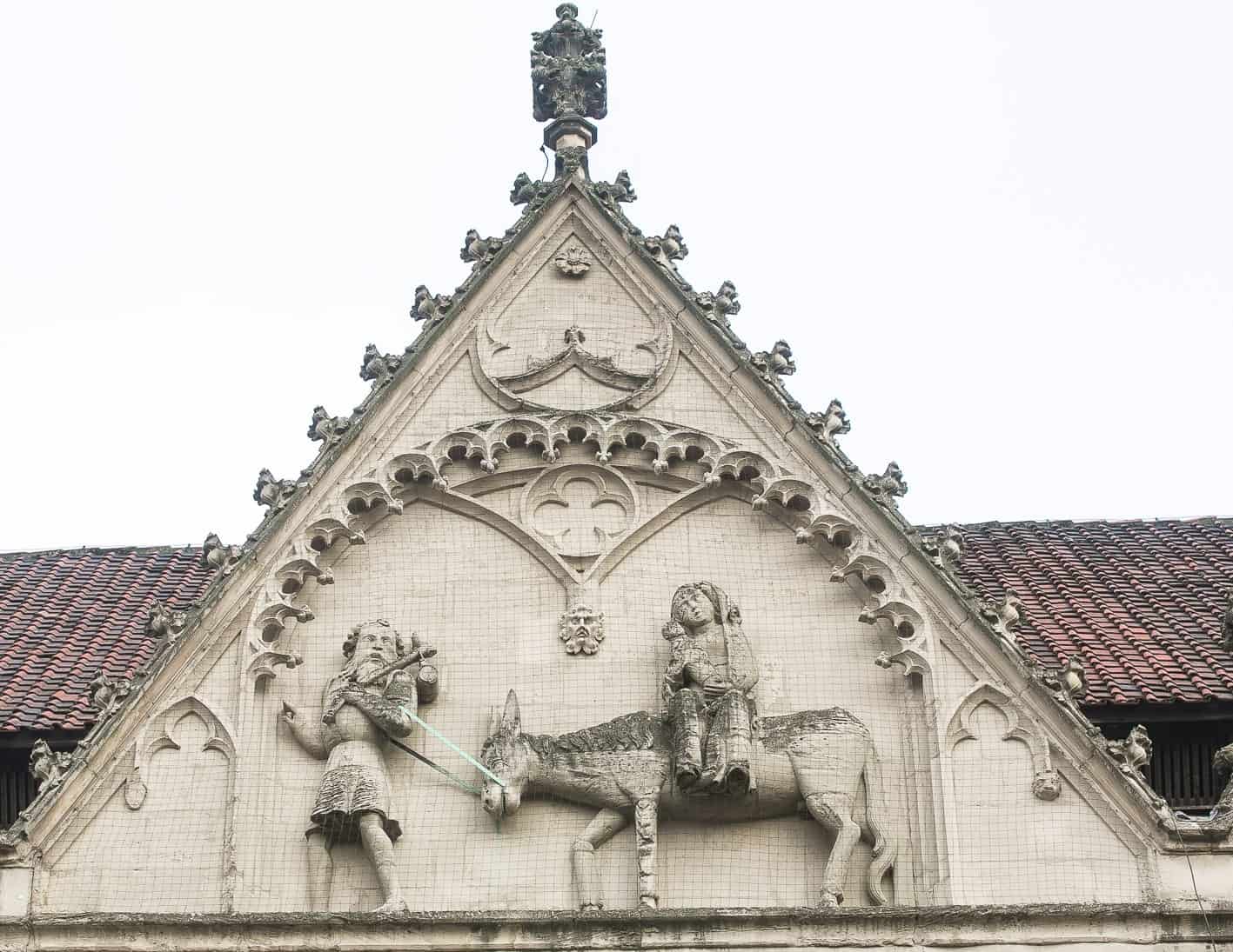 Und die „Krüppel“? Wir betrachten den Giebel, auf dem deutlich Jesus Christus erkennbar ist, auf einem Thron sitzend. Links und rechts daneben befinden sich insgesamt vier „Krüppel“. Doch diese Deutung ist umstritten und wird zurückgeführt auf eine Legende, die uns der Zollschreiber Herman Bote überliefert hat, dem wir bekanntlich auch schon das Buch von Till Eulenspiegel zu verdanken haben – was allerdings in neuester Zeit auch bestritten wird. Das 1515 in Straßburg erschienene Werk hieß richtig „Ein kurtzweilig Lesen von Dil Ulenspiegel geboren uß dem Land zu Brunßwick, wie er sein leben volbracht hat“ und erschien lediglich mit dem Verfasservermerk „N.“