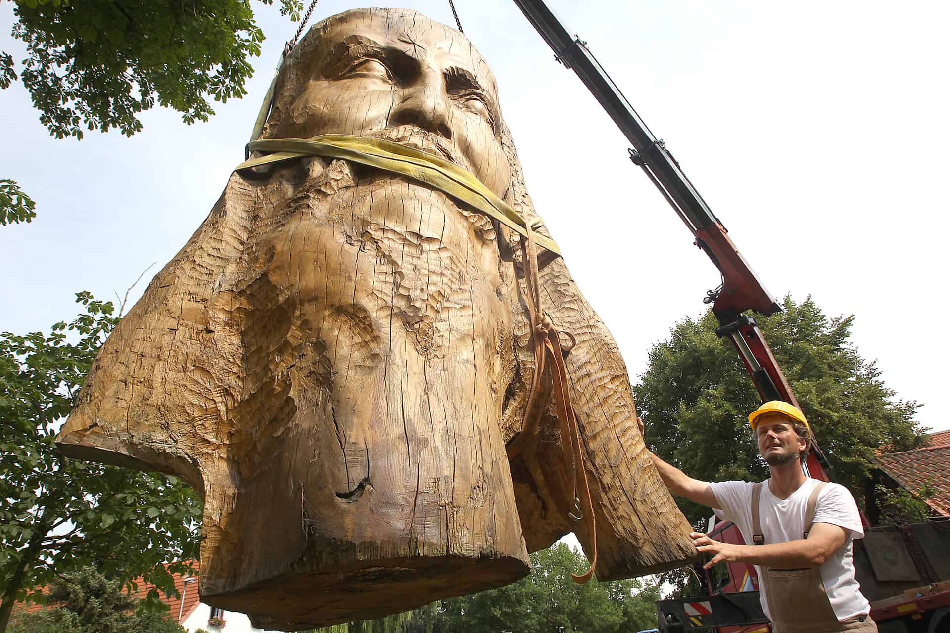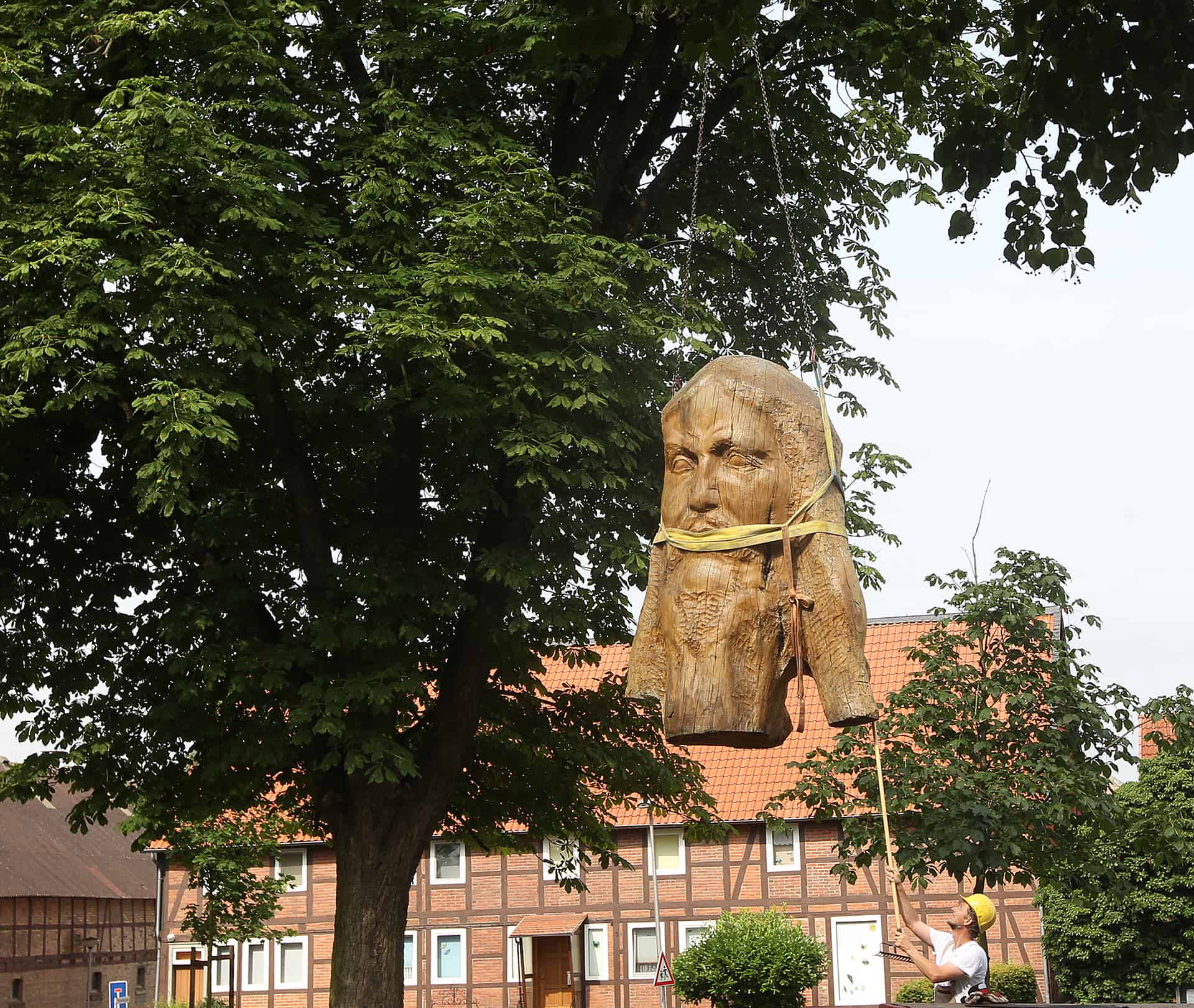 „So sieht es gut aus“, zufrieden blickt der Bildhauer Magnus Kleine-Tebbe auf die rund drei Meter hohe Skulptur, die ein Kran vor der Kirche in Salzgitter-Lesse auf einem kleinen Podest platziert hat. Anderthalb Jahre stand der Christuskopf aus einer rund 350 Jahre alten Eiche in Hornburg, in den nächsten Monaten wird er die Lesser begleiten. Die Skulptur wirbt für ein Kunstprojekt aus Anlass des 500-jährigen Reformationsjubiläums, das als Kooperation zwischen der Stiftung Prüsse und der evangelischen Landeskirche initiiert wurde.