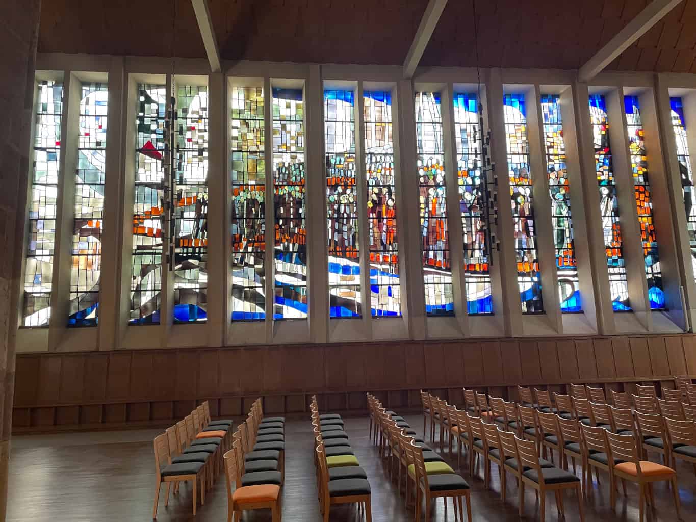 Der Wiederaufbau der Magnikirche nach dem Zweiten Weltkrieg wurde nach Plänen der Architekten Rudolf Pramann und Heinrich Otto Vogel in bewusst moderner Formensprache realisiert. „Die ursprünglicher Gestalt des Langhauses ist anhand der erhaltenen Pfeilerreihe mit Scheidbögen im Süden des Mittelschiffs noch ablesbar … Beim Wiederaufbau wurden die nördliche Pfeilerreihe und die Nordaußenwand beseitigt. Stattdessen errichtete man eine Betonkonstruktion mit raumhohen Fenstern“, erklärt Bauhistoriker Arnhold. Die Fensterwand ziert Glasmalerei von Hans Gottfried Stockhausen (1920–2010). Das 1961 geschaffene Kunstwerk stellt den Aufbruch des Volkes Israel auf dem Weg aus pharaonischer Knechtschaft in Ägypten zum „gelobten Land“ dar. Zur Wiedereinweihung 1964 erhielt die Kirche ein modernes Kruzifix von Ulrich Henn.