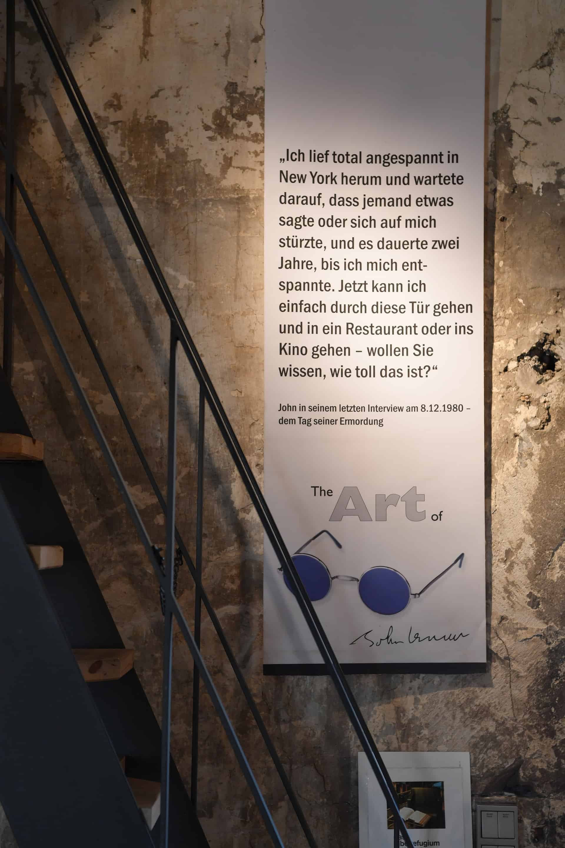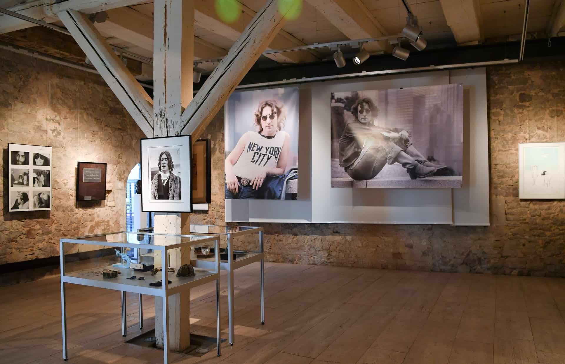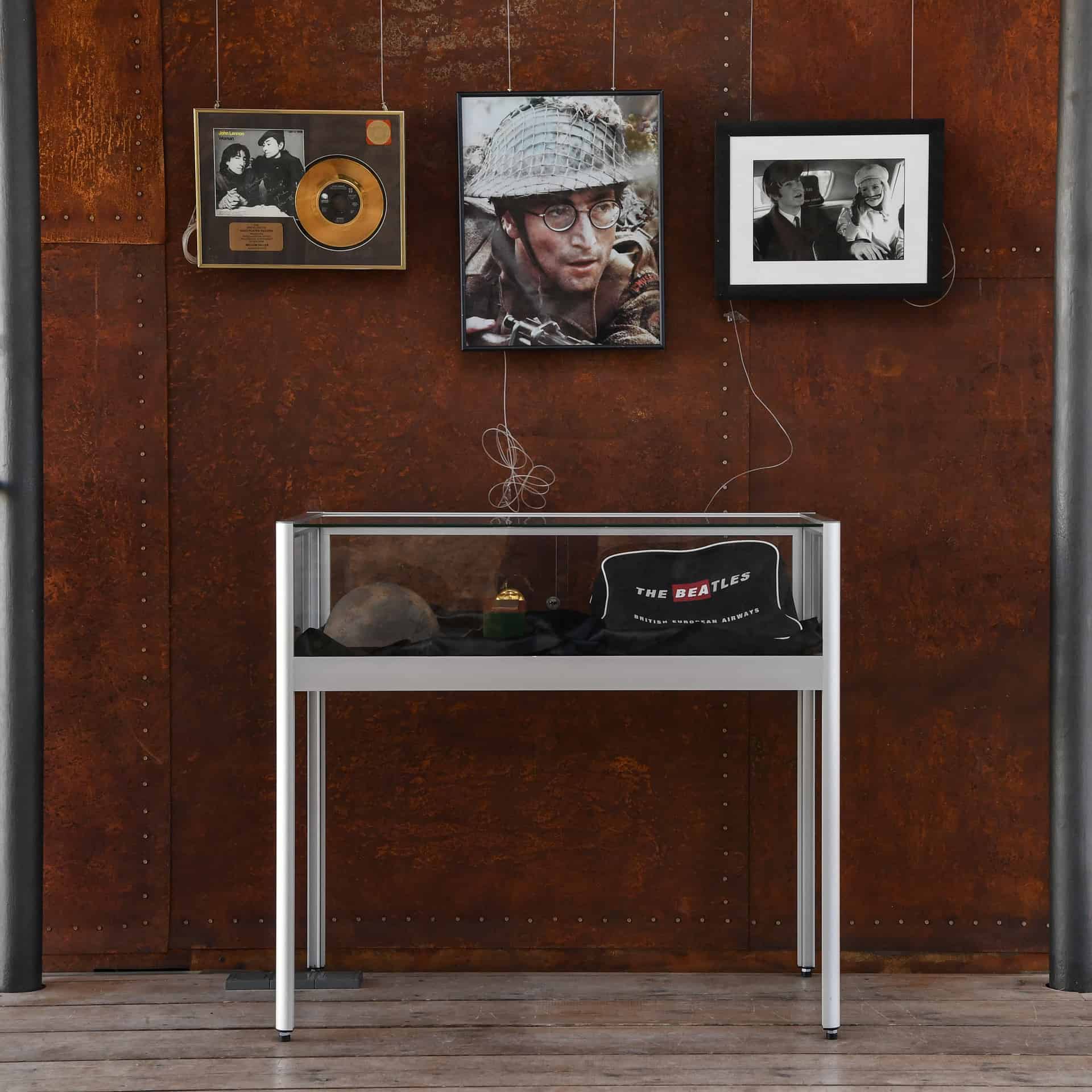 Es gibt frühe fotografische Portraits, die einen coolen jungen Mann zeigen, und Bilder von den Dreharbeiten zu dem Film „Wie ich den Krieg gewann“, bei dem John Lennon den Gefreiten Gripweed spielte. Für diese Rolle ließ er sich die Haare schneiden und trug erstmals eine Nickelbrille. In den Vitrinen findet sich Persönliches: Brillen, Halsschmuck, Auszeichnungen, eine Tasche von British Airways mit dem Aufdruck „The Beatles“. Auch signierte und veredelte Schallplatten gehören zur Ausstellung. Für Stifter Jochen Prüsse sind die Friedensaktivitäten Lennons von besonderer Bedeutung. „Mit den ‚War is over‘-Aktionen, die er 1969 mit seiner Frau Yoko startete, traf er direkt mein Herz und meinen Verstand“, sagt Prüsse. Dokumentiert werden diese Aktivitäten beispielsweise durch die Plakat-Aktion „War is over“.