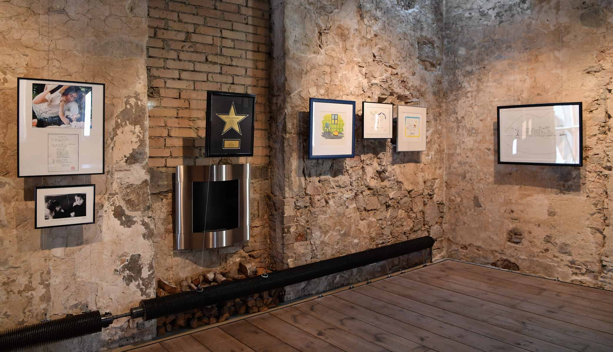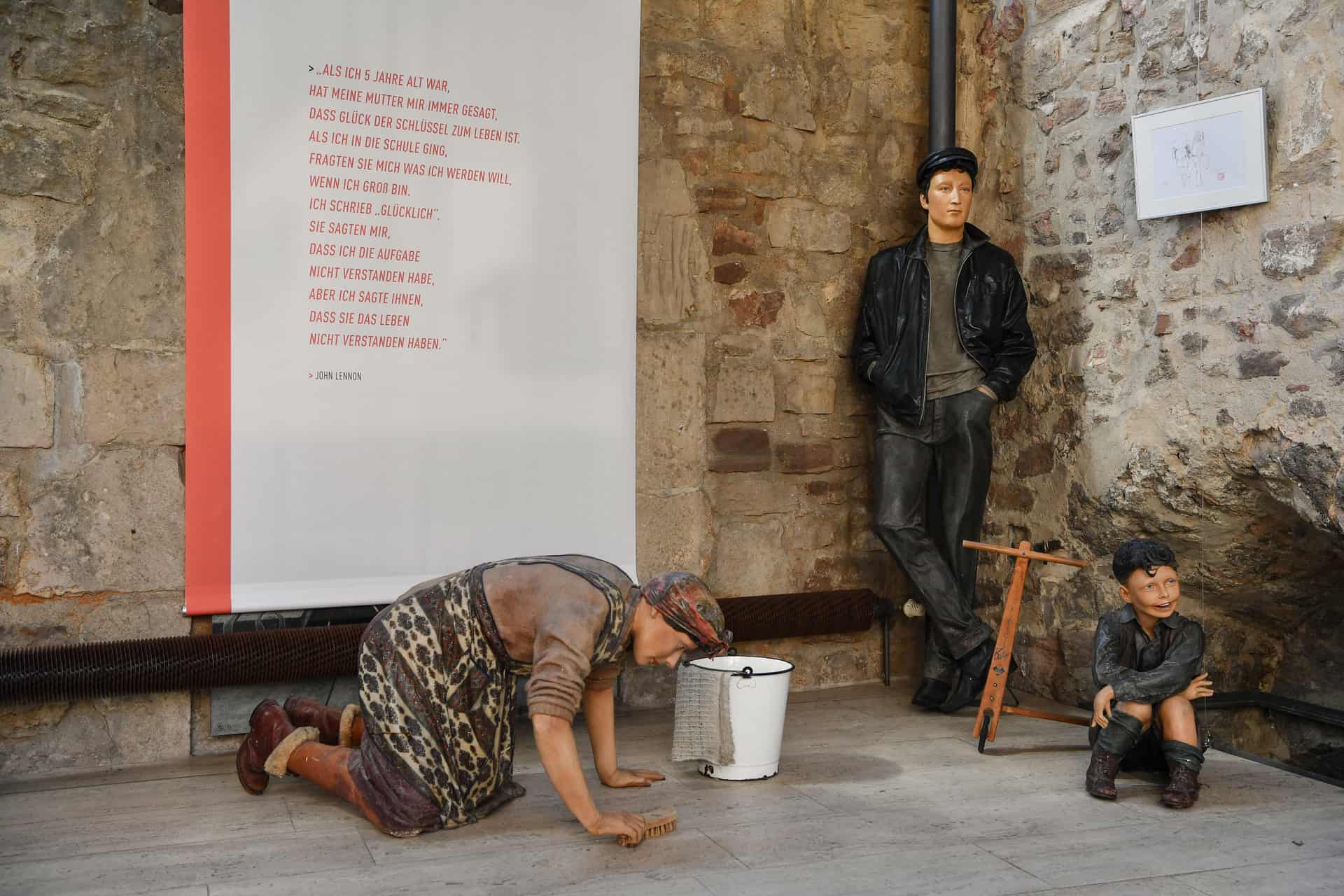 Die Ausstellung, die die Stiftung Prüsse in der Reihe „Doppel-Talente“ initiiert hat, bietet jedoch weitaus mehr als Zeichnungen, Lithografien und Karikaturen. Wer die Jakob-Kemenate betritt, wird von einer lebensgroßen Figurengruppe begrüßt. Die Figuren zeigen in hyperrealistischer Manier John Lennon als jungen Mann, lässig mit Lederjacke und Schiebermütze, seine Tante Mimi und – vermutlich als Rückblick – den fünfjährigen John. Geschaffen wurde die Gruppe, die sich heute in Privatbesitz befindet, von einer Londoner Künstlerkooperative.